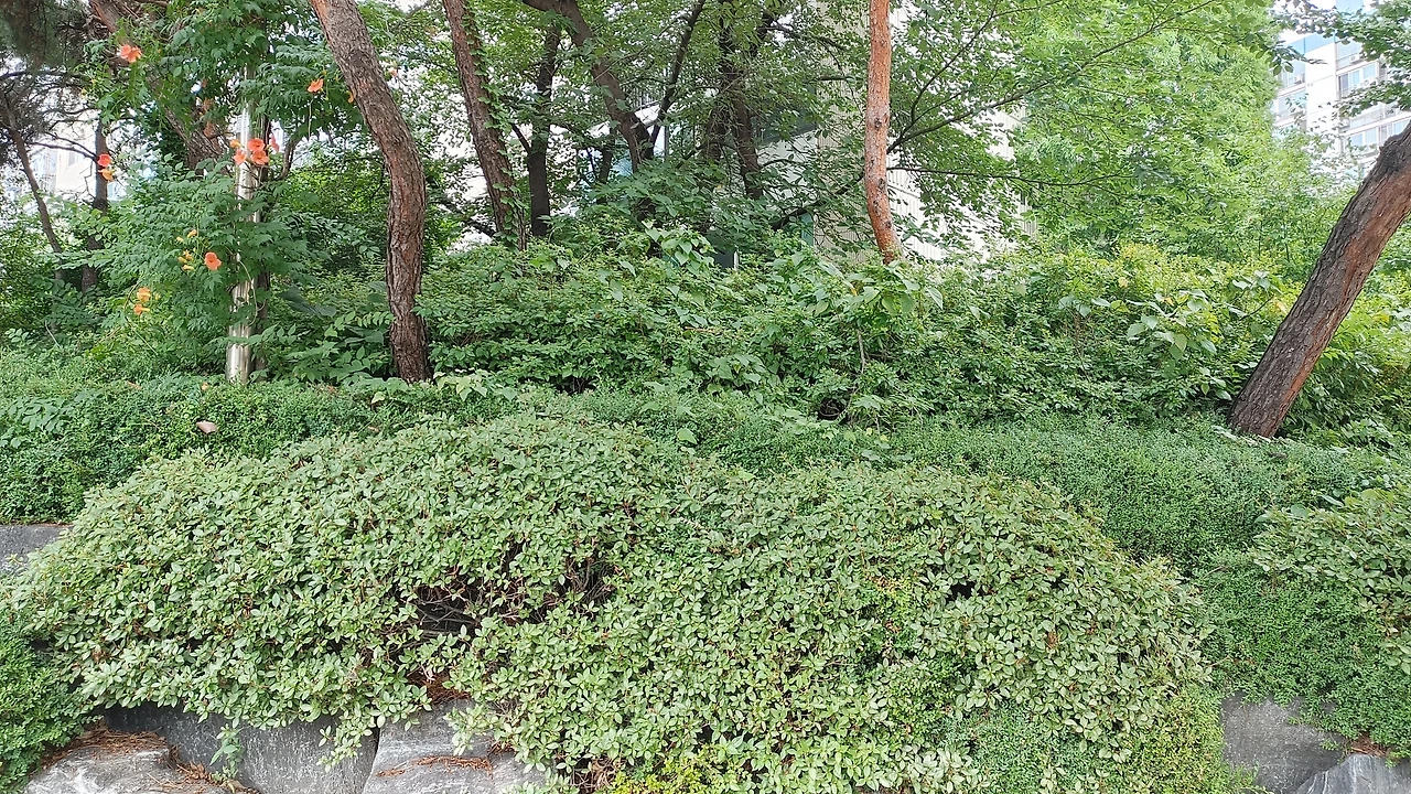 우후죽순 자란 잡풀과 소나무는 도심 아파트에서도 쑥쑥 잘 자란다.