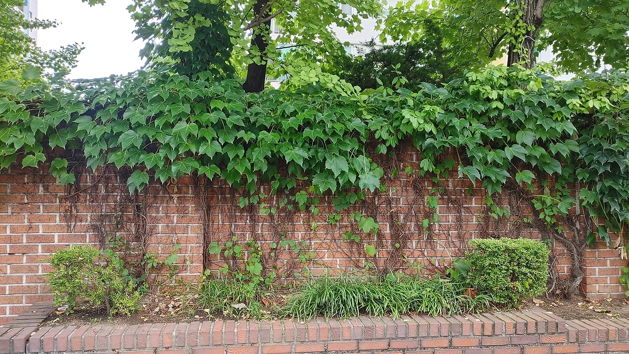 아파트 담장으로 담쟁이넝쿨이 반짝반짝 빛이 난다.