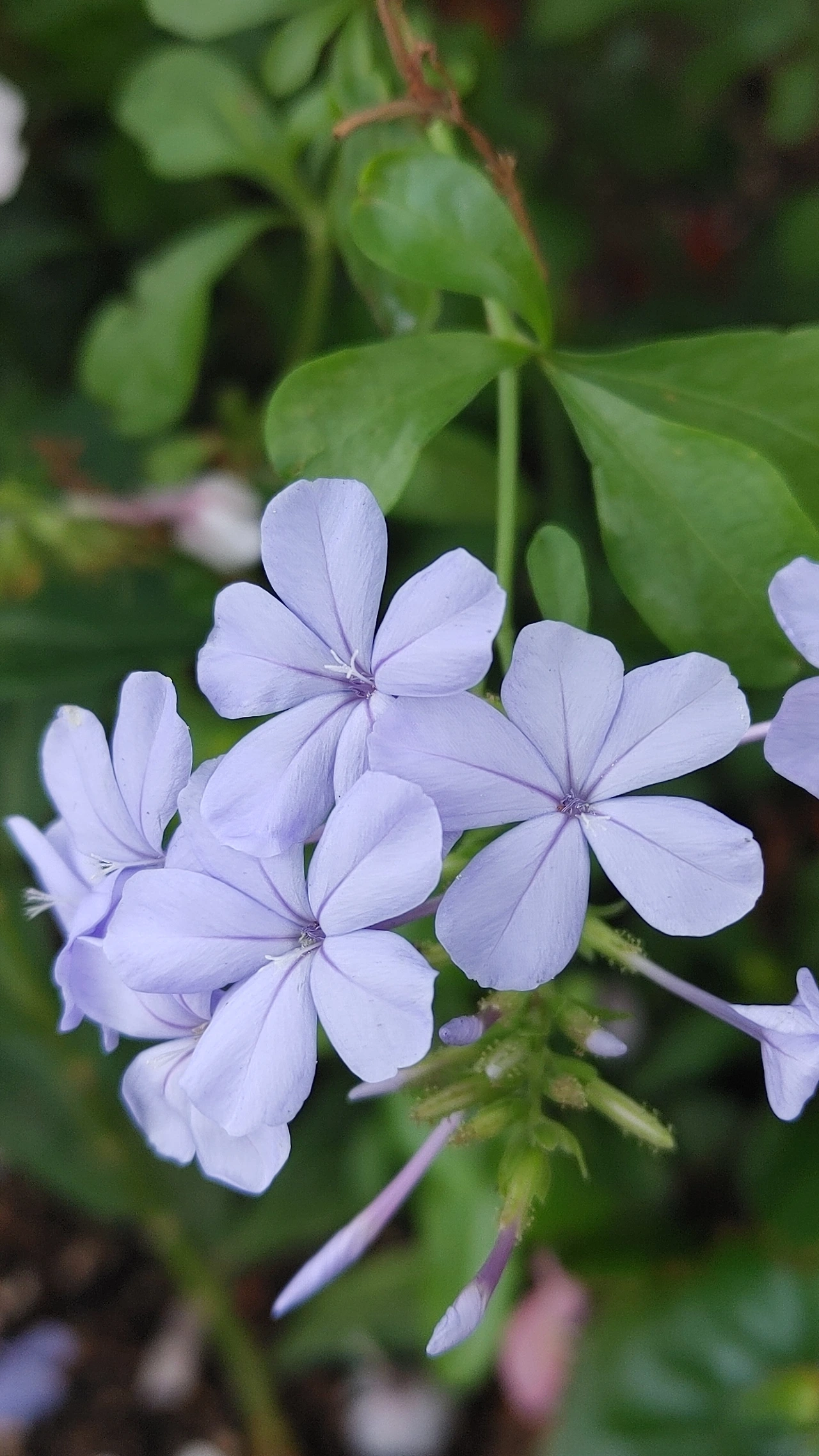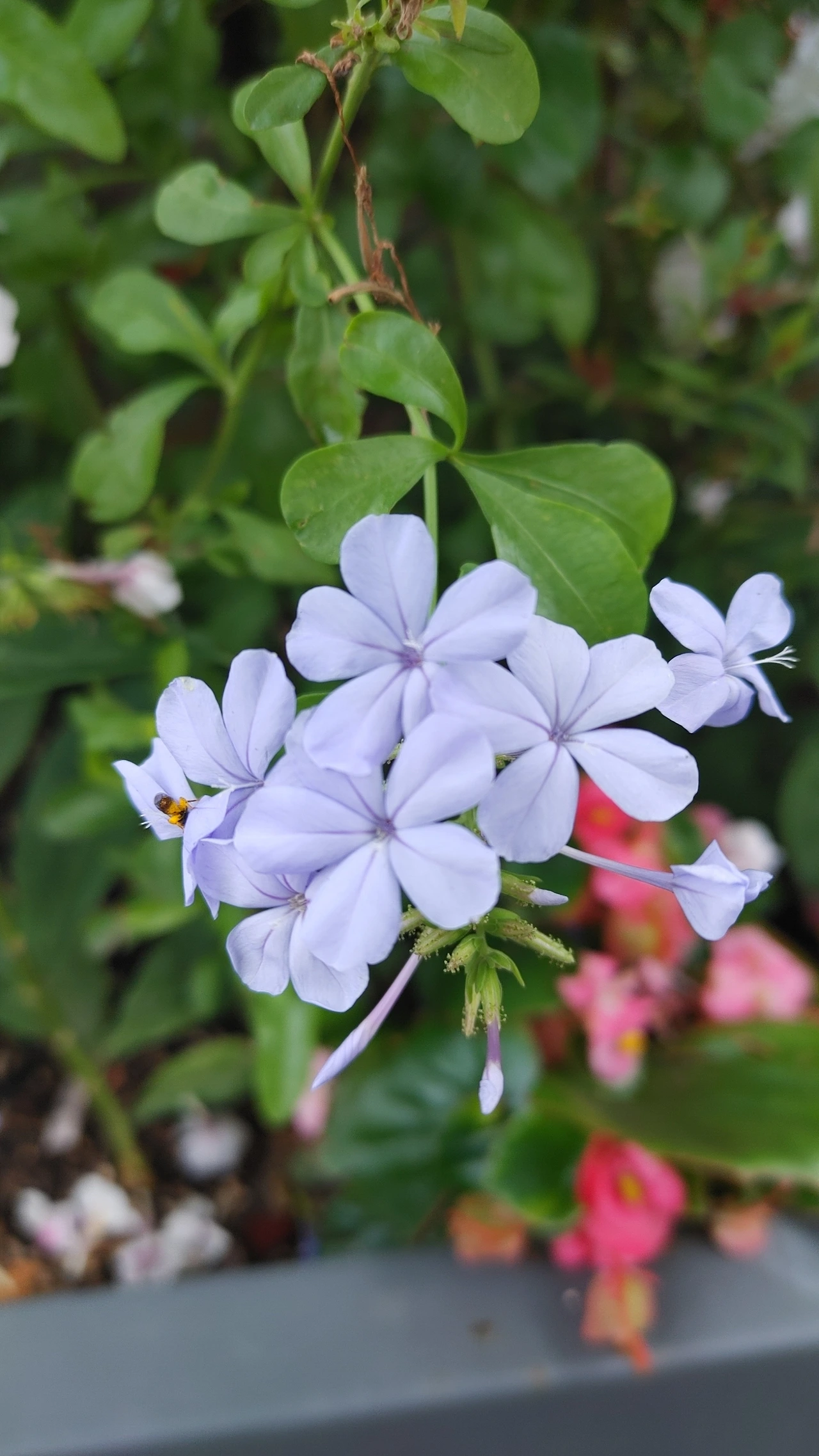 푸른 보랏빛 플럼바고 알파는 꽃은 익숙한데 이름이 낯설다. 원산지는 남아프리카이며, 열정과 도전이란 꽃말을 가지고 있다고 한다. 꽃잎 사이에 고개를 숙인 노랗고 검은 줄무늬 벌이 반갑다.