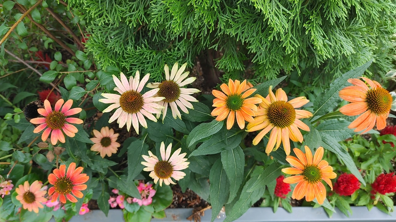 에키네시아는 국화과에 속하며 번식력도 좋고 생명력도 좋아 한번 심으면 해마다 피어난다고 한다. 알록달록 색깔도 모양도 과꽃인가 하고 보았더니 과꽃은 아니다.