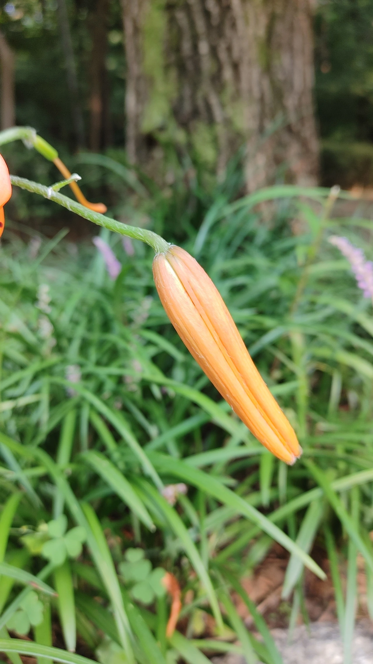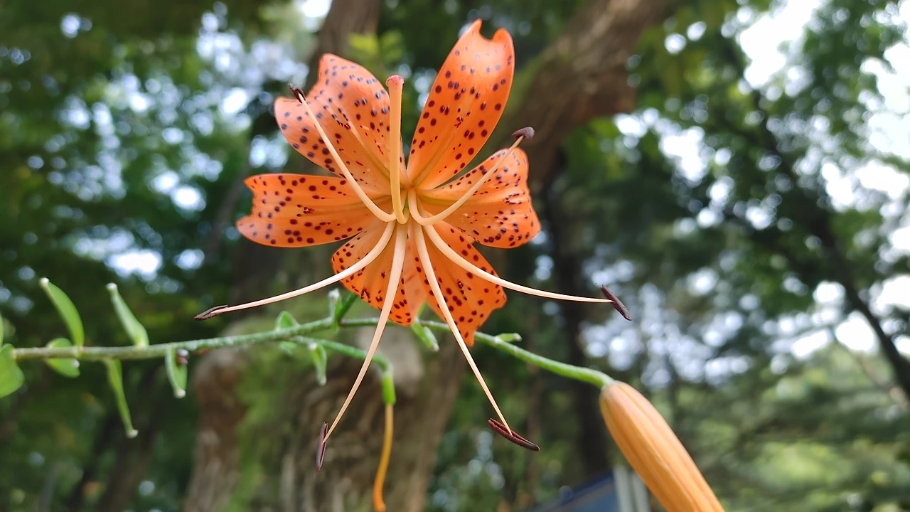 주황색 꽃이 피기 전 꽃잎은 연둣빛노랑인데 시간이 지나면서 점점 진한 주황색이 된다. 꽃잎이 바소 모양인데 역시 땅을 향해 있다. 제법 다소곳하다. 나리꽃은 줄기의 키가 커서 몸을 낮추고 아래에서 사진을 찍으니 제모습을 온전히 카메라에 담을 수 있다.