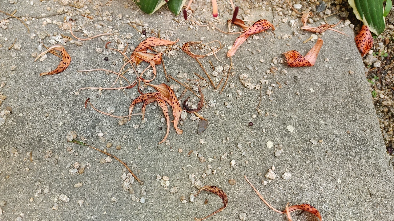꽃은 주황색에 자주색 점이 많은 꽃이 피고 흑자색 점이 많고 지름은 10~12cm이고 줄기에 4~20개가 밑을 향해 달린다. 화피(주황색 꽃잎) 6장이다. 꽃잎은 꽃받침과 꽃부리의 구별이 명확치 않은 화피로 밖에 3장은 꽃받침에 해당하는 외화피이고 안의 3장은 꽃잎에 해당하는 내화피라고 한다. 외화피와 내화피라는 것을 처음 알았다. 백합과 식물에서는 꽃 필 때 꽃받침이 발달하여 꽃잎처럼 보인다고 한다. 이를 화피(tepal)이라고 한다고 한다.