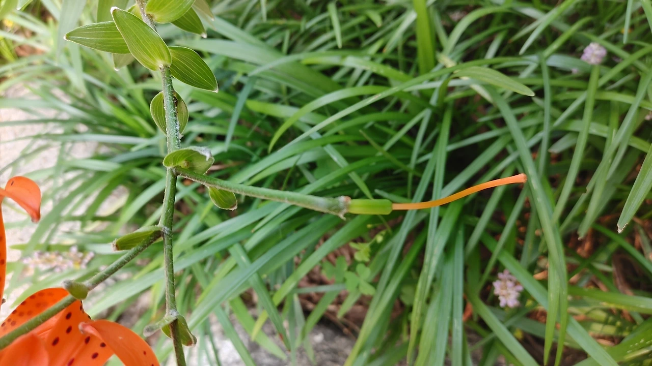 참나리가 자라는 모양이 제각각이다. 곧게 자라는 참나리도 있지만 키가 커서 그 무게를 이기지 못하고 쓰러지기도 한다. 곧게 자란 참나리 뿌리에서 가까운 줄기를 보니 꽤 굵고 단단해 보인다. 쓰러진 참나리는 키가 워낙 커서 줄기가 지탱을 하지 못한 것 같다.