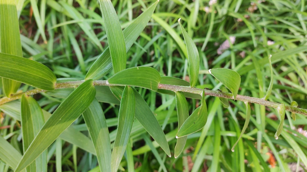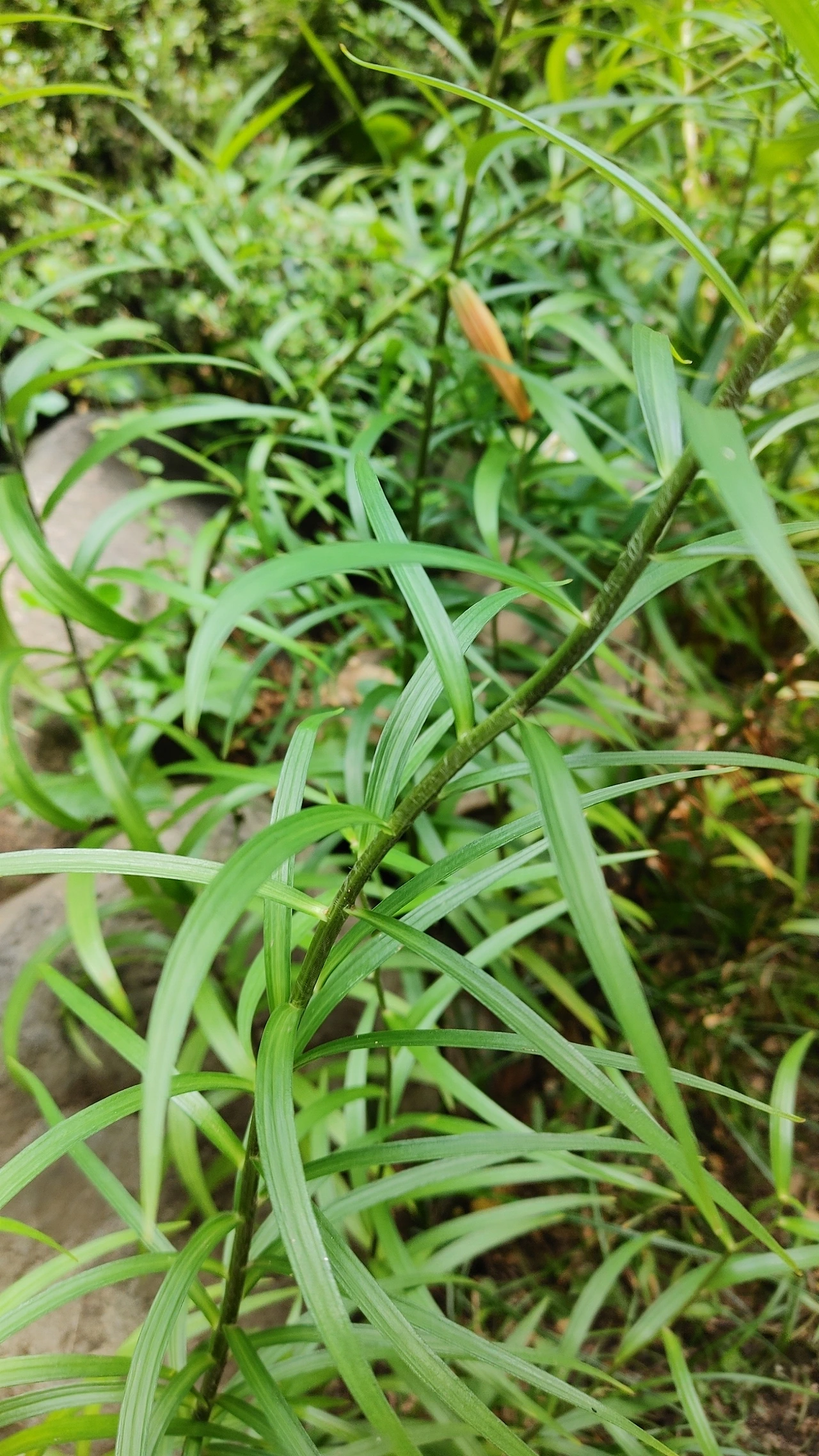 잎은 5~20여 cm로 크기가 다양하며 길쭉하다. 대여섯 개의 잎맥이 있다. 잎은 줄기 아래에서 무성하게 자라고 위로 갈수록 드문드문하다. 줄기에는 갈고 가는 털이 나고 잎은 줄기에 돌려난다. 사진으로 찍어서 보아도 잎이 자라는 모습과 줄기에 하얀 잔털이 잘 보인다.