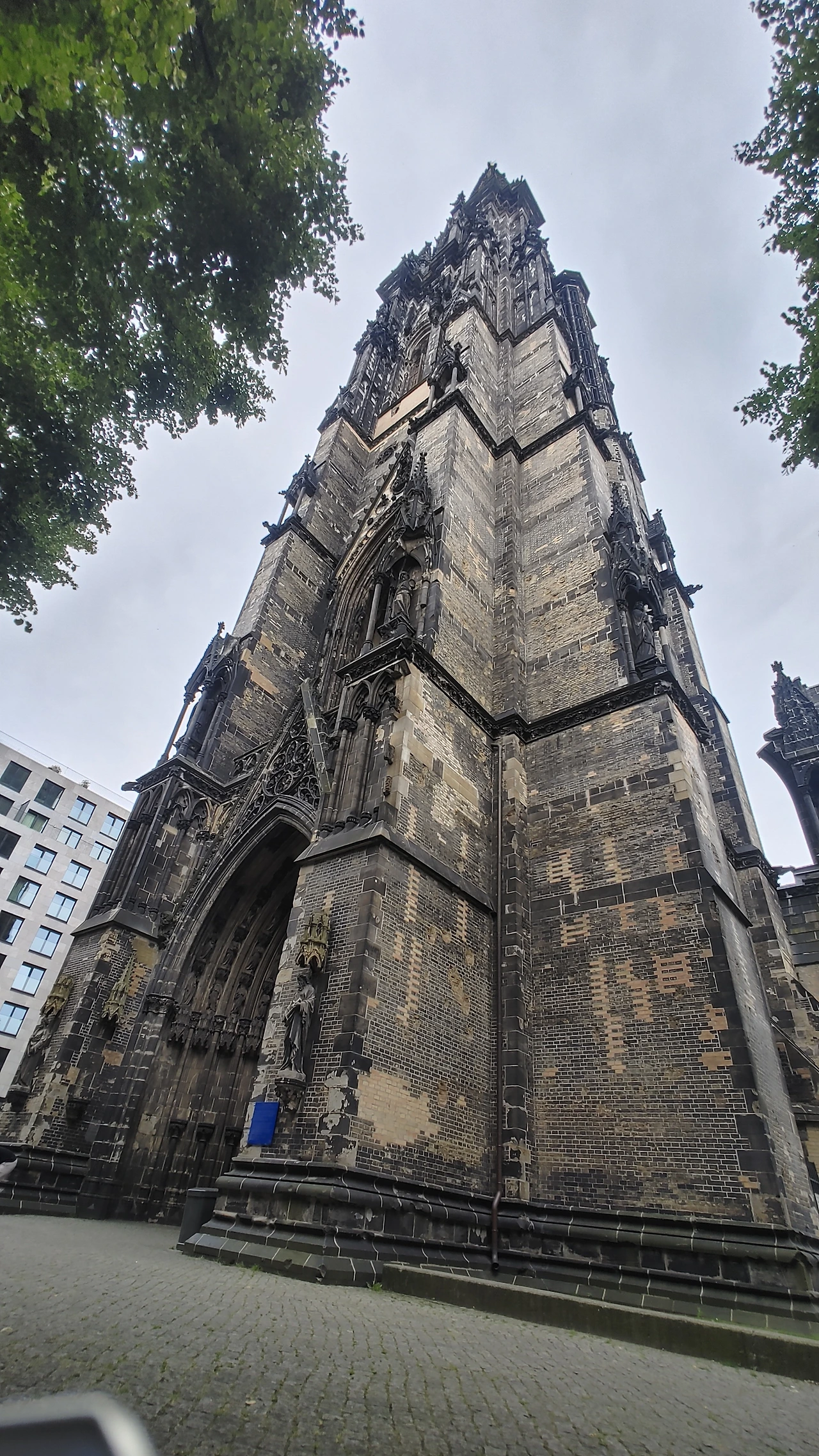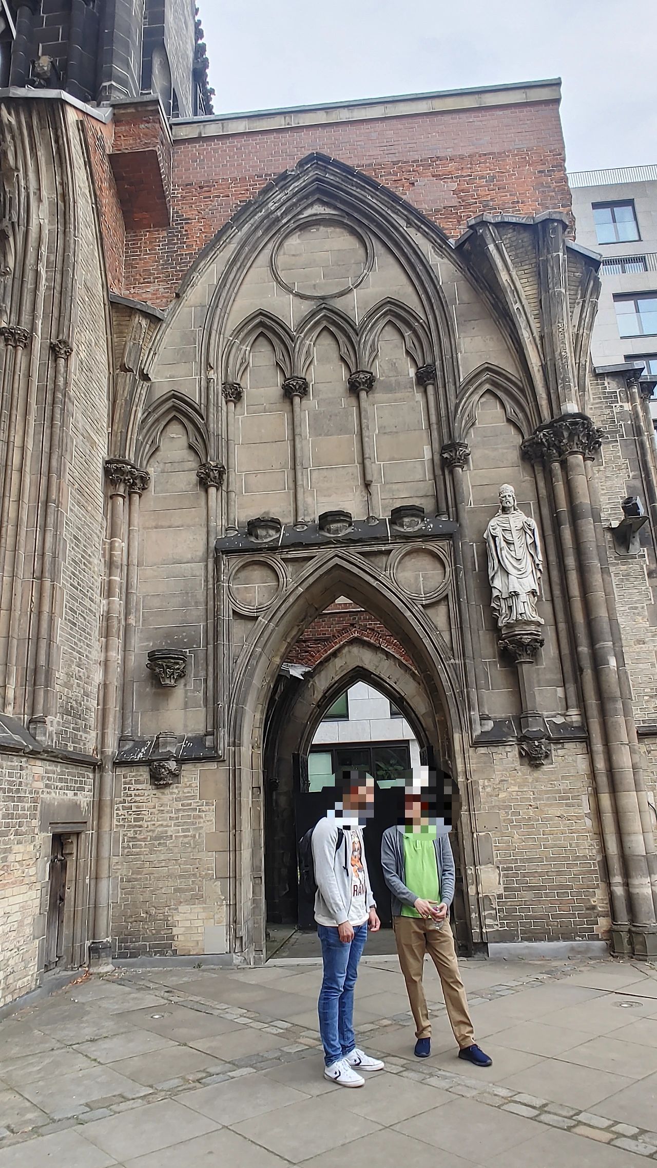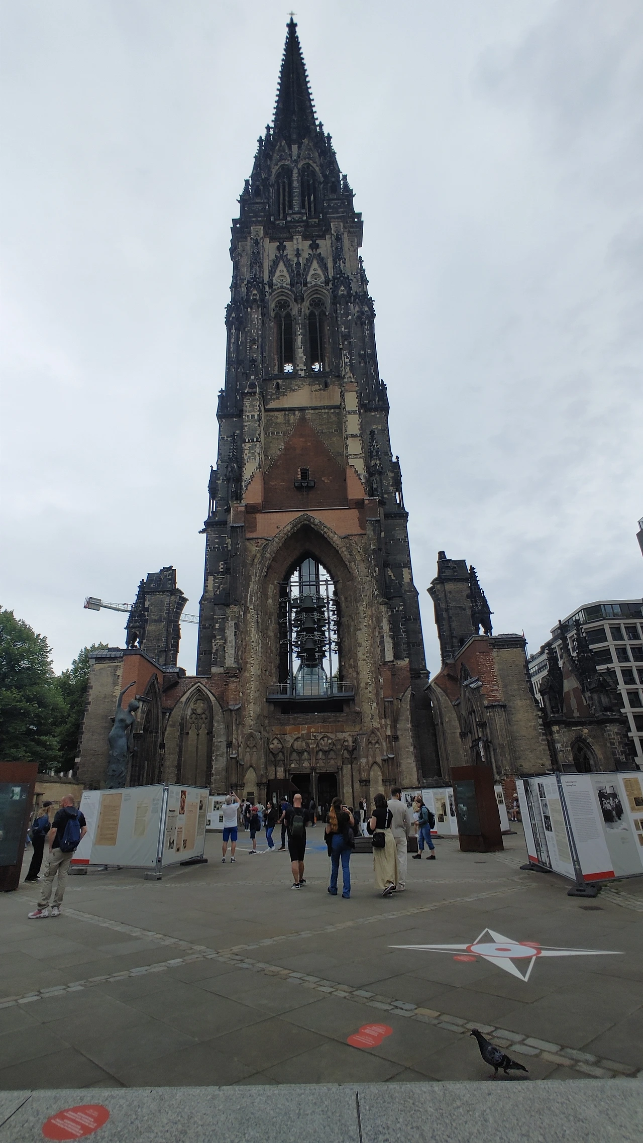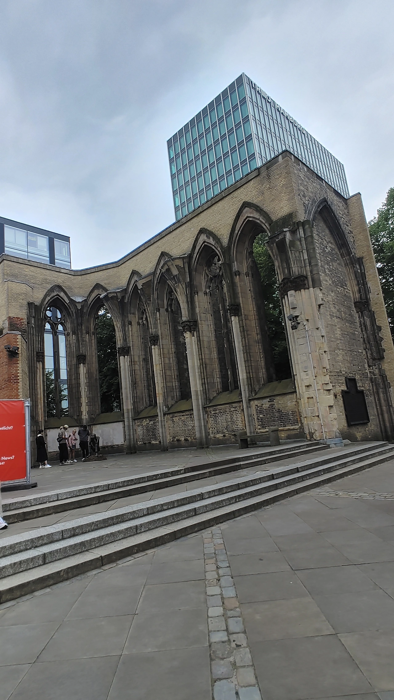성니콜라이 교회 앞에는 공원이 형성되어 있고 동상도 하나 있다. 멀리서 걸어갈 때마다 첨탑이 보여서 눈길을 끈다. 성벽은 검은색인데 제2차 세계대전 때 폭격을 맞아 그을음으로 검은 벽돌이 되었다. 독일 유적지는 전쟁으로 많이 유실되었고 전쟁 때 입은 폭격의 흔적으로 검은 벽돌이 많다. 입구를 통해 들어가니 건축물은 온데 간데없고 휑하니 성당 외부의 도로와 도시의 건축물이 그대로 보인다. 광장을 중심으로 외벽으로 빙 둘러서 남아있는 건축물들이 전쟁의 참혹함을 보여주고 있다.