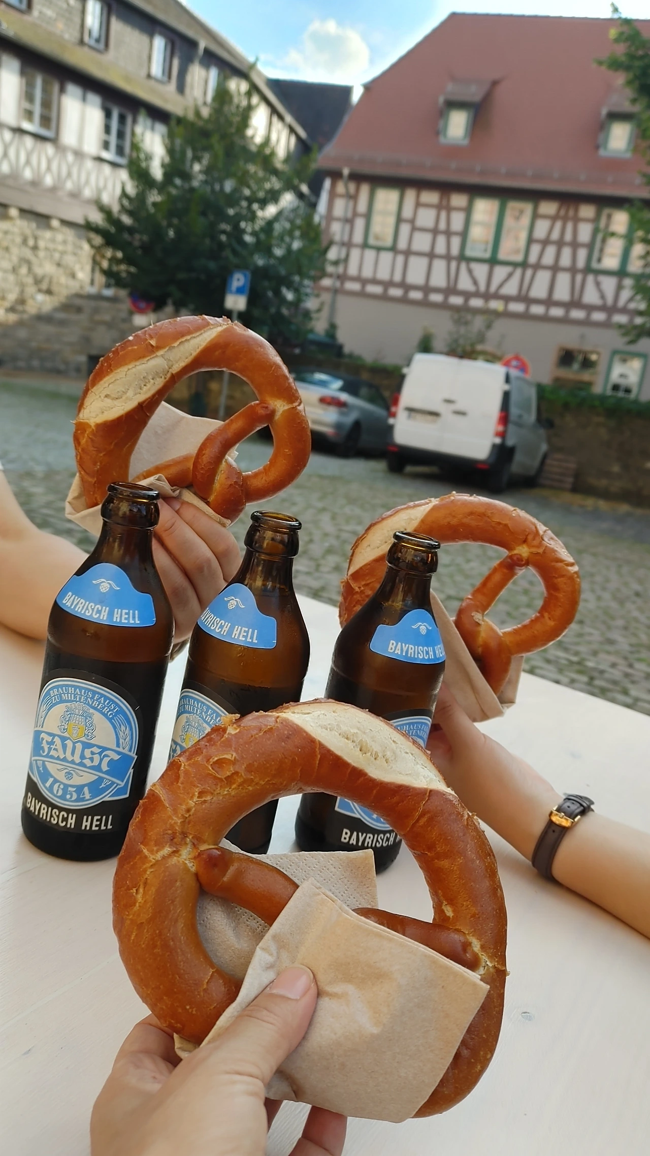 공연장소에 도착했다는 안도감에 배고픔이 밀려왔다. 공연 시작 30분 전이라 음식점에서 식사는 할 수 없어서 교회 광장 간이 푸드 코트에서 맥주와 빵을 샀다. 맥주가 파우스트 맥주다. 파우스트를 보기전 파우스트 맥주라. 와! 신박하다. 적갈색빛을 내며 짭조름하고 담백한 빵인 브레첼 도넛도 샀다. 빵을 안주삼아 마시는 시원한 맥주는 술술 들어갔다. 배도 고프고 목도 말랐다. 맥주와 빵을 모아 사진을 찍으니 그것도 작품성이다.