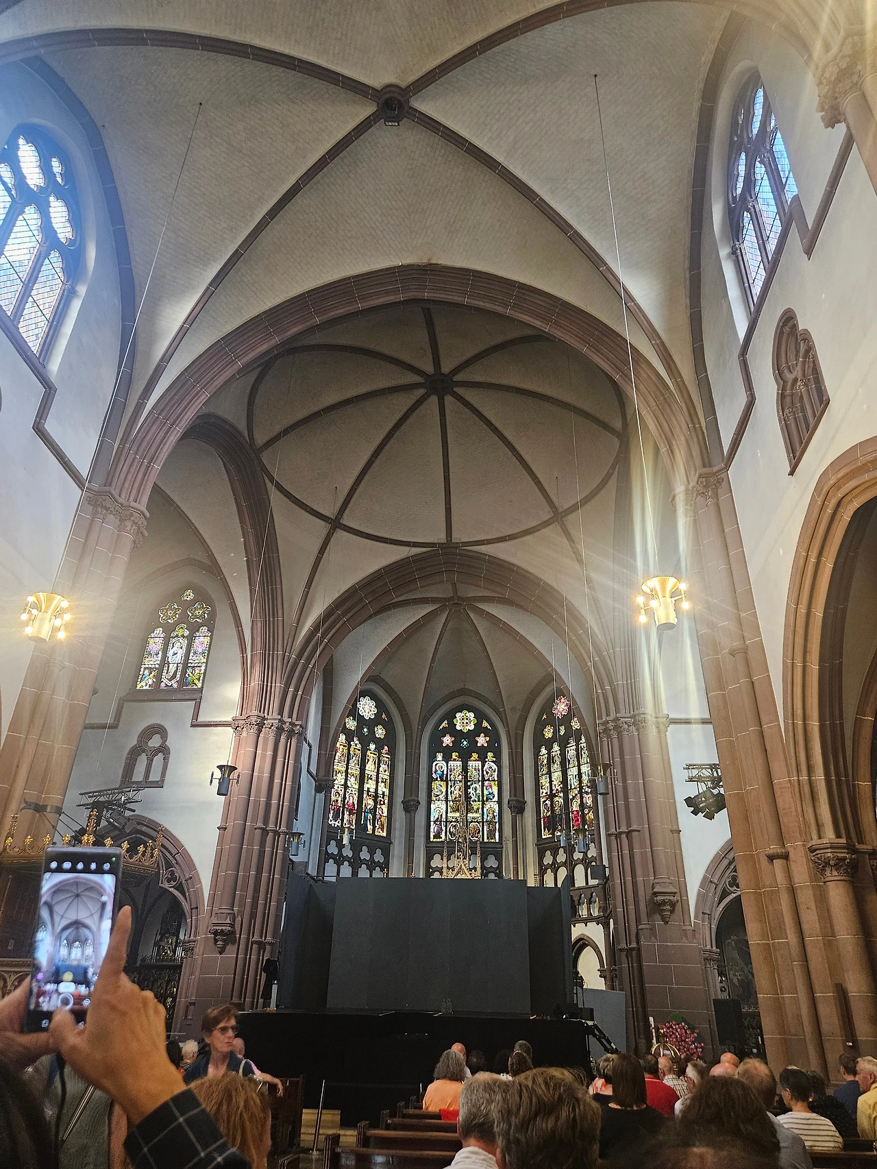 입장시간을 알리는 안내방송을 듣고 입장했다. 제단 앞에 검은 막이 있고 무대가 높게 설치되어 있었다. 나중에는 하얀무대가 되었다. 음향을 담당하는 사람이 교회 중간 오른쪽에 있었다. 관람객이 속속들이 입장했는데 대부분은 70~80대 노인들이었다. 동양인이나 이방인은 우리밖에 없었고, 젊은 사람도 거의 눈에 띄지 않았다. 초등학생으로 보이는 아이를 데리고 온 젊은 엄마 한 명이 있을 뿐이었다. 관람객은 100여 명쯤 되어 보였다.