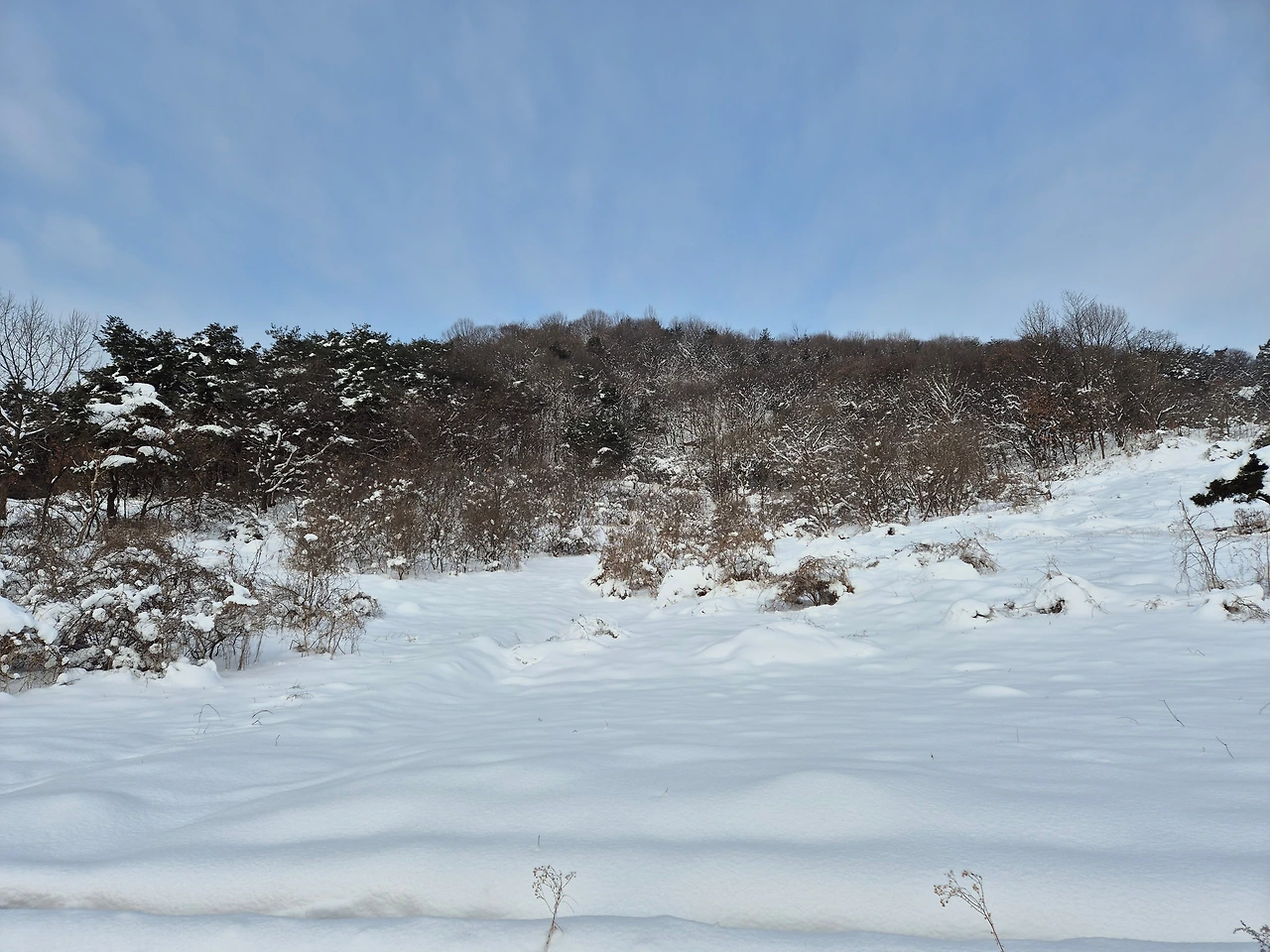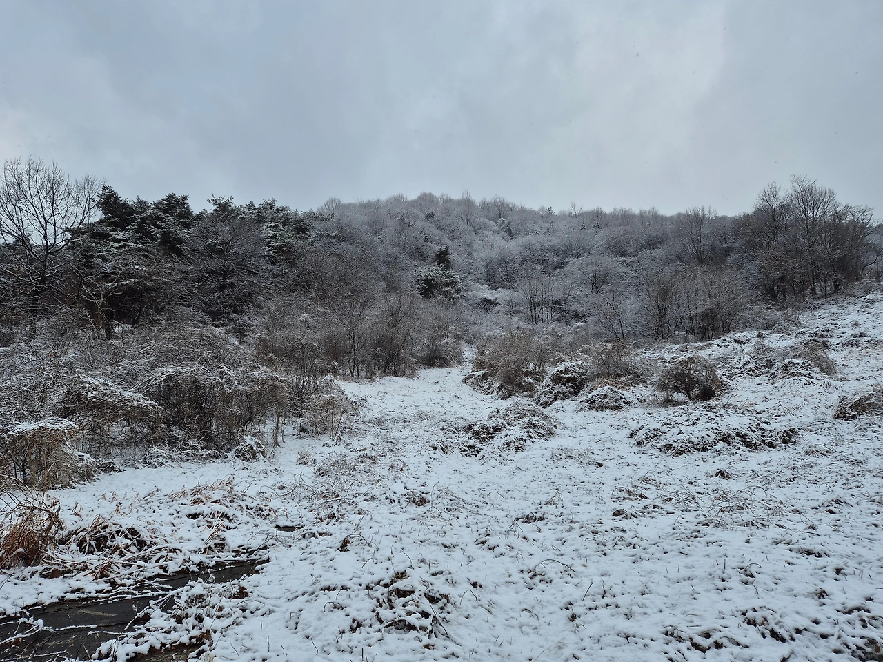 짙푸른 소나무 숲에 얕게 눈이 내려앉았다. 몽글몽글 소나무에 하얀 떡가루를 뿌려놓은 듯하다. 2030이라면 슈가파우더를 뿌려놓았다고 표현했으려나. 소나무 숲 사이에 활엽수가 떨어진 앙상한 나무의 잔 가지까지 하얀 옷을 입었다. 진갈색 나뭇잎을 달고 있는 나무가 산아래 밭에 서서 눈산을 가리지만 하얀 설 산만이 눈에 들어온다. 밭에 심어진 복숭아나무는 잔가지들을 활짝 펴고 깊은 잠을 자고 있다. 가을거지를 끝낸 고추밭에 고춧대도 하얀 홑이불을 덮었다. 벼 벤 논에는 벼 쭉정이 꽁지가 하얀 추위에 얼었다. 산 아래 밭은 어느 해부터인가 풀숲만 무성한 덤불숲이 되었는데 말라비틀어진 덤불숲에도 하얀 눈이 내렸다.