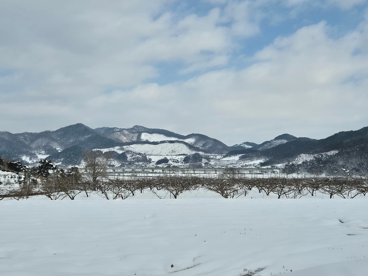 눈이 멈춘 하얀 구름 사이로 파란 하늘도 보인다. 야트막하게 펼쳐진 짙푸른 소나무 숲 사이로 내려앉은 눈은 숲아래로 스며들었다. 멀리 보이는 소나무숲은 언뜻언뜻 흰 눈이 보이면서 푸르기만 하다. 산을 깎아 고속도로를 놓은 민둥산은 흰 눈이 가득하다. 복숭아밭 너머에 이차선 국도와 고속도로, 기찻길은 한산하다. 고향을 오가야 하는 자식들 가는 길이 미끄럽지는 않은지 걱정이다. 다행히 큰 도로는 제설 작업을 해놓아서 눈이 녹았다. 자식들 운전하고 오고 가는 데는 어렵지 않겠다. 모처럼 내린 큰 눈에 선뜻 길을 나선 자식들이 안전하게 고향에 오기를 바란다.