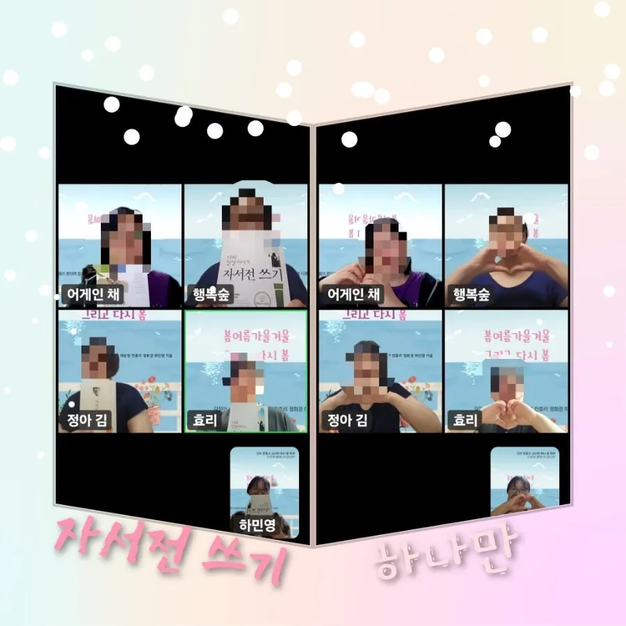 목적이 분명할수록 어떤 일을 행하는데 성공률이 높다. 하나만 회원들이 자서전을 쓰려고 하는 이유를 들어보았다. 하나만에 들어올 때부터 자서전을 쓰고 싶다고 했던 행복숲님은 처음에는 막연하게 자서전을 쓰고 싶다고 생각했다고 했다. 퇴직을 앞두고 있는 지금은 과거를 돌아보는 시간을 갖고 싶다고 했고, 퇴직하면 시간도 많으니 자서전을 쓰면서 보내는 것도 좋을 것 같다고 했다. 혜령 님은 하작가님이 쓰자고 하니 쓰는 것이라고 하여 웃었다. 덧붙여서 자신이 일기를 쓰고 마음 빼기 명상을 통해서 과거를 회고해 본 바에 의하면 자서전을 쓰면서 자신과 화해하고 치유하는 효과가 있을 것이라고 했다. 정아님은 자신을 정리하는 시간을 갖고 싶다고 했다. 죽을 것 같은 순간을 견뎌왔던 시간, 아이들에게는 말하지 못한 것들, 기록하면서 감사하려고 한다고 했다. 어게인채님은 올해는 아무것도 안 하려고 했는데 하나만에서 같이 하자고 하니 해야 될 것 같은데 고민해 보겠다고 했다. 회원들의 자서전 쓰기에 대한 의견을 들으면서 필자도 자서전을 쓰려는 목적을 정리했다.