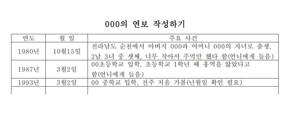 첫째, 노트에 무조건 적는다. 노트와 펜을 준비하고 연도, 월일, 주요 사건을 기록할 수 있도록 칸을 나눈다. 작성시간은 처음에는 10분에서 30분 이내로 생각나는 대로 빠르게 적는다. 정확하지 않아도 되니 기억나는 대로 적는다.