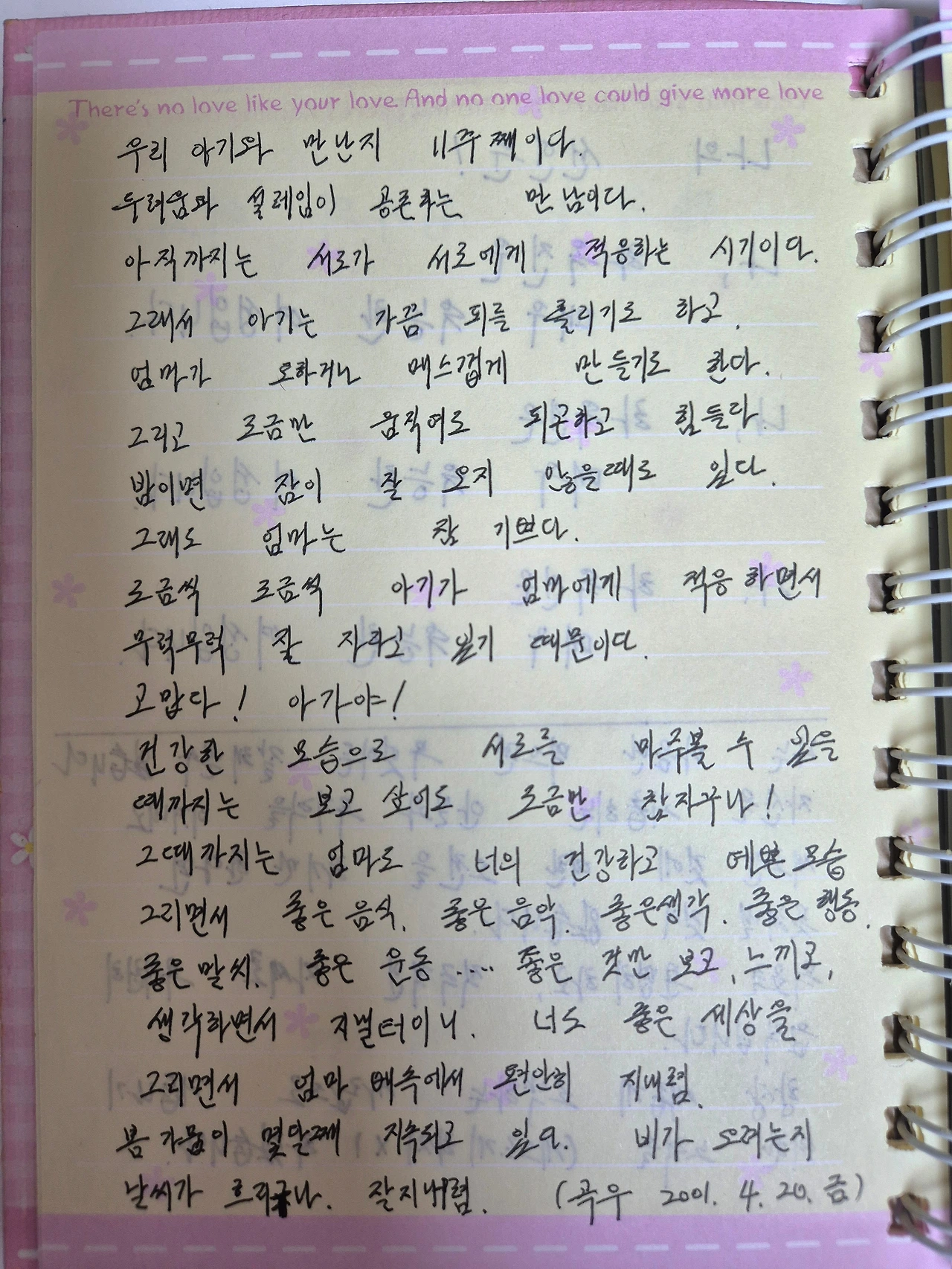 당시의 두려움과 기대 등을 일기장에 담기 시작했다. 그리고 일기장은 아이와 함께 성장하면서 점점 채워갔다. 나중에 아이가 자라서 결혼할 때쯤 선물하려고 꼼꼼하게 작성했다. 아이가 얼마를 먹고 얼마나 자주 깨고 뒤집기는 언제 했고 엄마라고 언제 불렀고 두 발로 설 때는 언제였는지 등 아이의 성장을 자세히 기록했다. 2001년 4월 쓰기 시작한 일기장 몇 쪽을 소개하면 다음과 같다.
