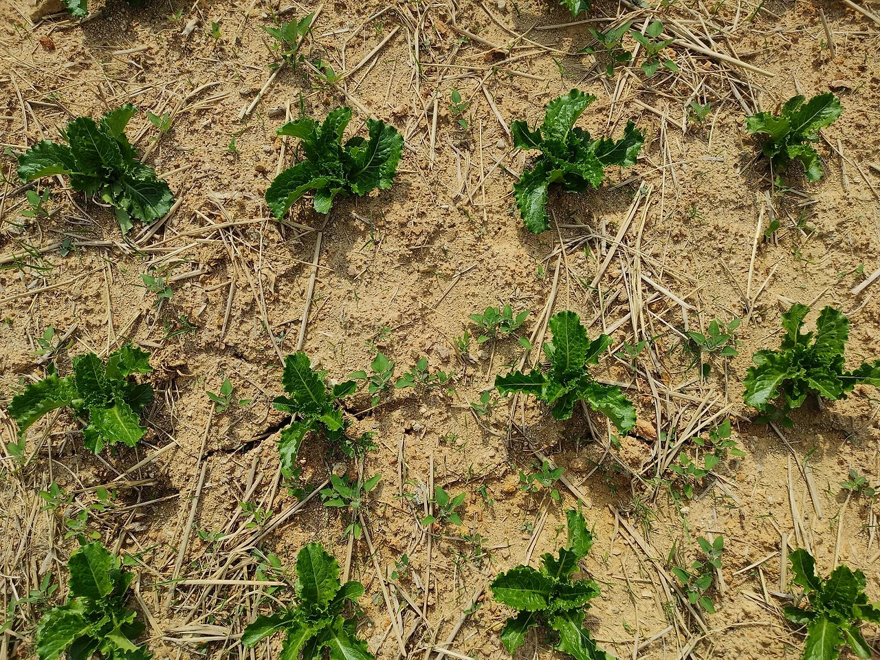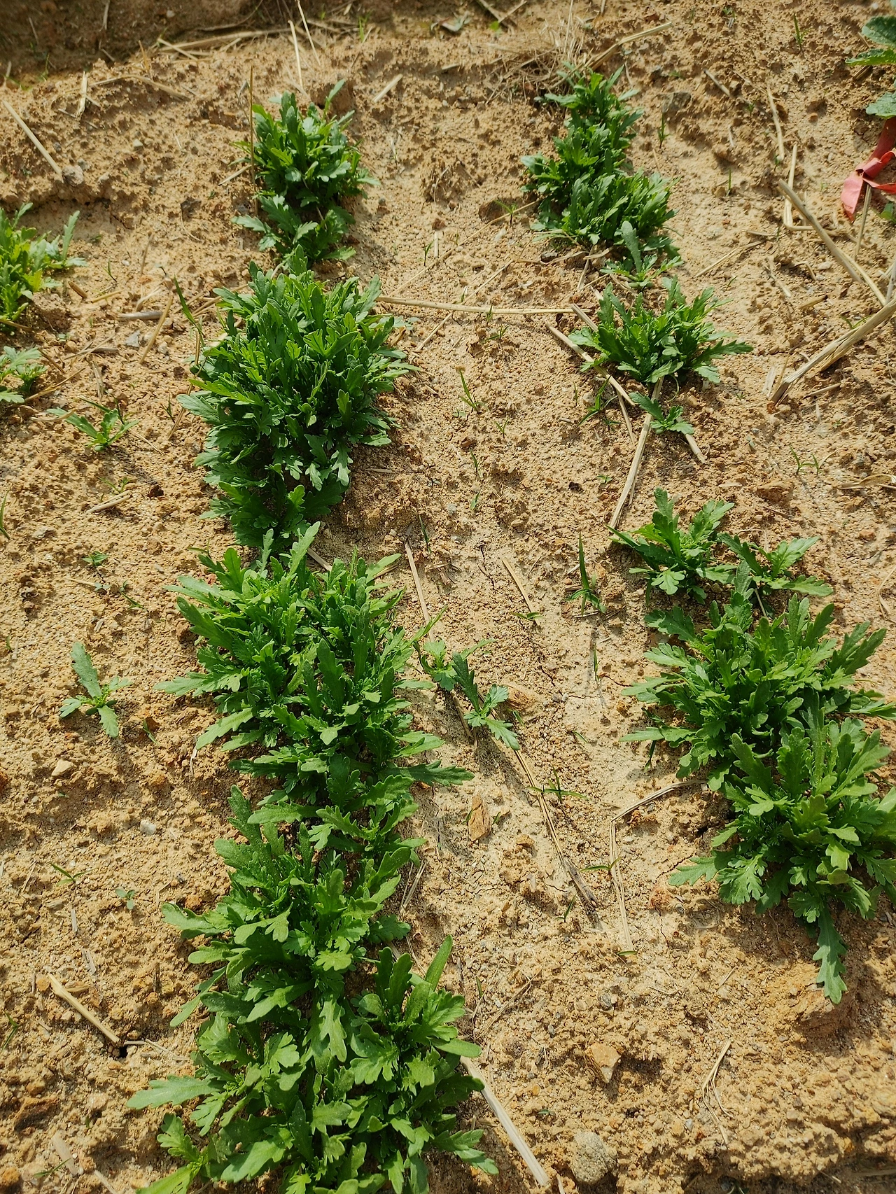겨자채 이외의 다른 작물들도 모두 파릇파릇 잘 자라고 있었다. 모종으로 심었던 청상추(두종), 적상추, 치커리, 겨자채, 당근, 깻잎, 파, 당귀가 한 구획에서 자라고 있었다. 모든 모종들이 이제 걱정하지 않아도 될 정도로 자리를 잘 잡았다. 또 다른 구획에서는 씨를 뿌렸던 쑥갓, 열무, 근대, 당근이 새싹을 틔우고 제법 채소다운 모습을 갖추어가고 있었다. 씨 뿌리기 했던 열무는 하트 모양의 손톱만 한 크기에서 10cm 정도 자랐다. 쑥갓과 근대도 6~7cm가량 자라서 어떤 채소인지 알아볼 정도다. 당근은 손가락 크기 정도로 아직 어리지만 싹이 제법 잘 올라왔다. 작물들 모두가 자신의 건강함을 뽐내기라도 하는 양 진한 초록색을 이루고 있었다.