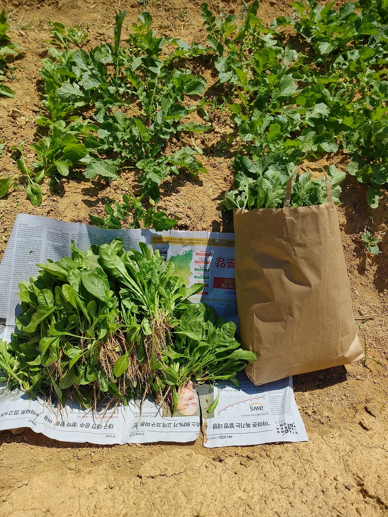 이번에는 많이 일한만큼 수확한 채소도 꽤 많았다. 물오른 채소를 많이 수확하여 나눠먹을 수 있어서 다행이다. 지인들과 채소를 나누려고 공원에서 만났다. 나는 채소 자랑을 위해 신나게 봉투를 열어젖혔다. 지인 중 한명이 물었다.