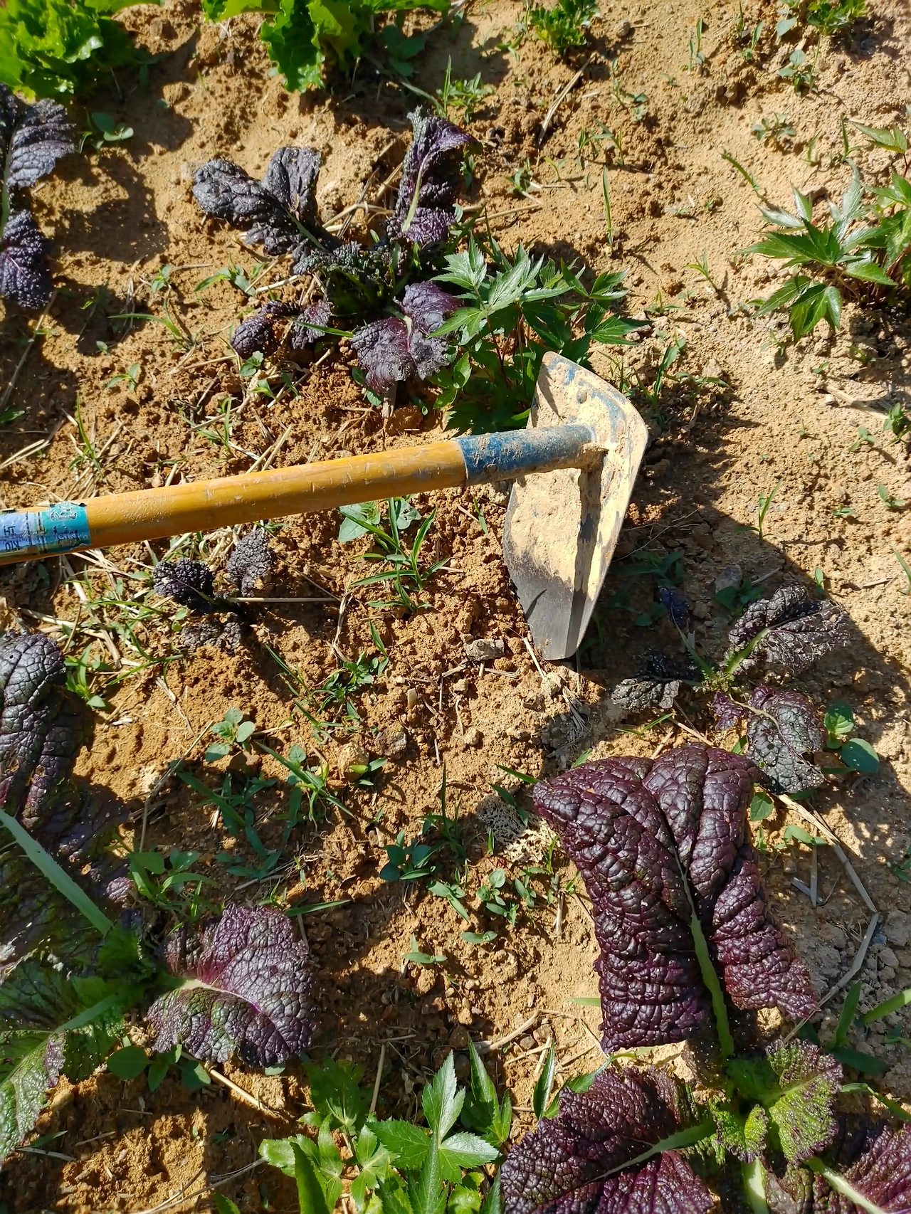 이번 주는 할 일이 많았다. 김매기, 솎음하기, 잎채소 수확하기, 웃거름 주기 등 제법 일할 양이되었다. 지난주보다 채소들도 많이 자랐지만 풀들도 함께 많이 자랐다. 고랑의 풀들은 괭이로 캤고, 작물 사이사이에 자란 풀들은 호미로 뿌리째 뽑았다.