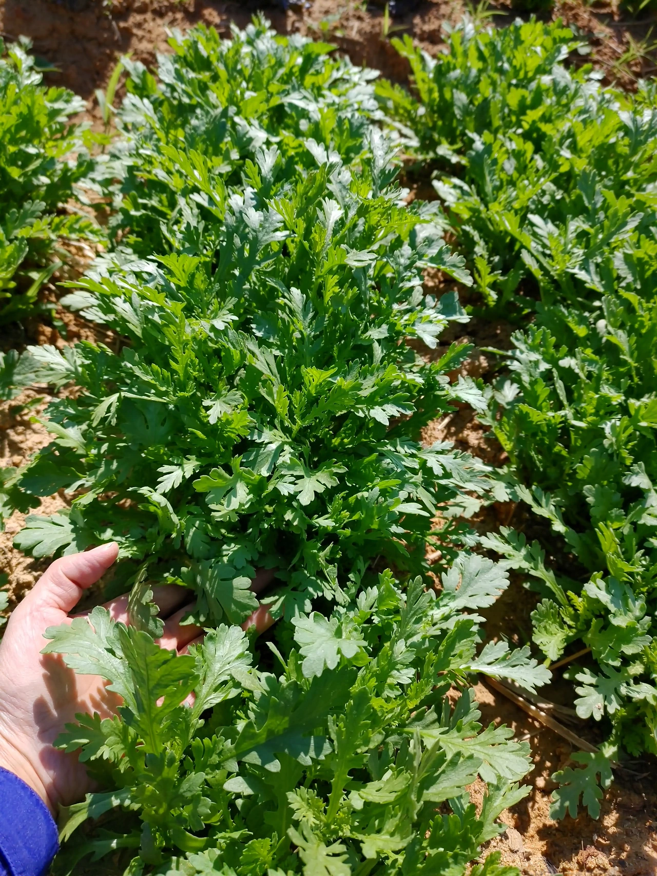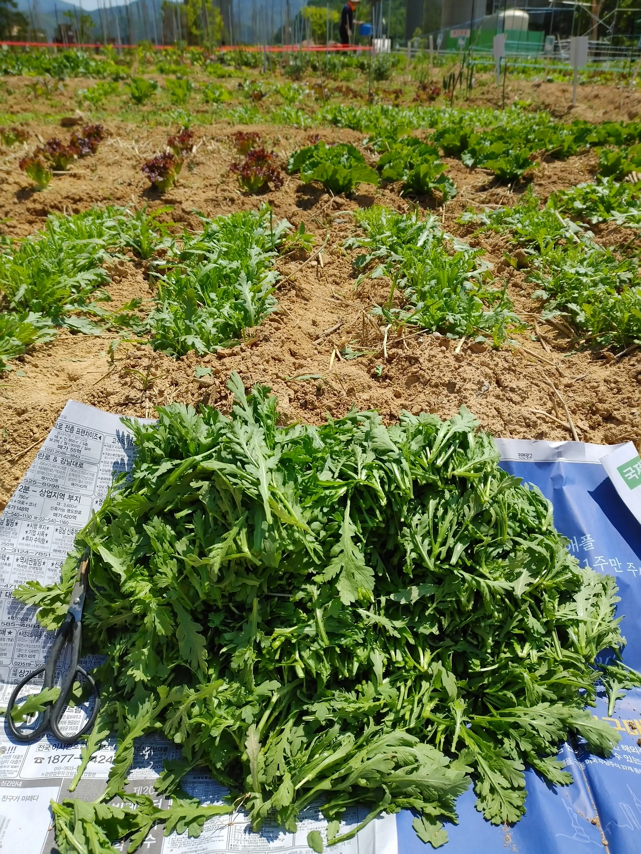 쑥갓은 예전 경험으로 미루어보아 솎아주기를 하지 않아도 튼튼하게 잘 자랐다. 그래서 솎음을 하지 않기로 했다. 쑥갓을 아래나 옆에서 잎을 따는 것보다 위를 자르는 것이 좋다고 판단했다. 쑥갓을 옆에서 따면 위로 자라서 빨리 딱딱해졌기 때문이다. 전지가위로 머리 부분을 싹둑싹둑 잘라서 수확했다. 여리고 푸른 쑥갓이 어찌 그리 빛깔이 곱고 향기로운지 모르겠다.