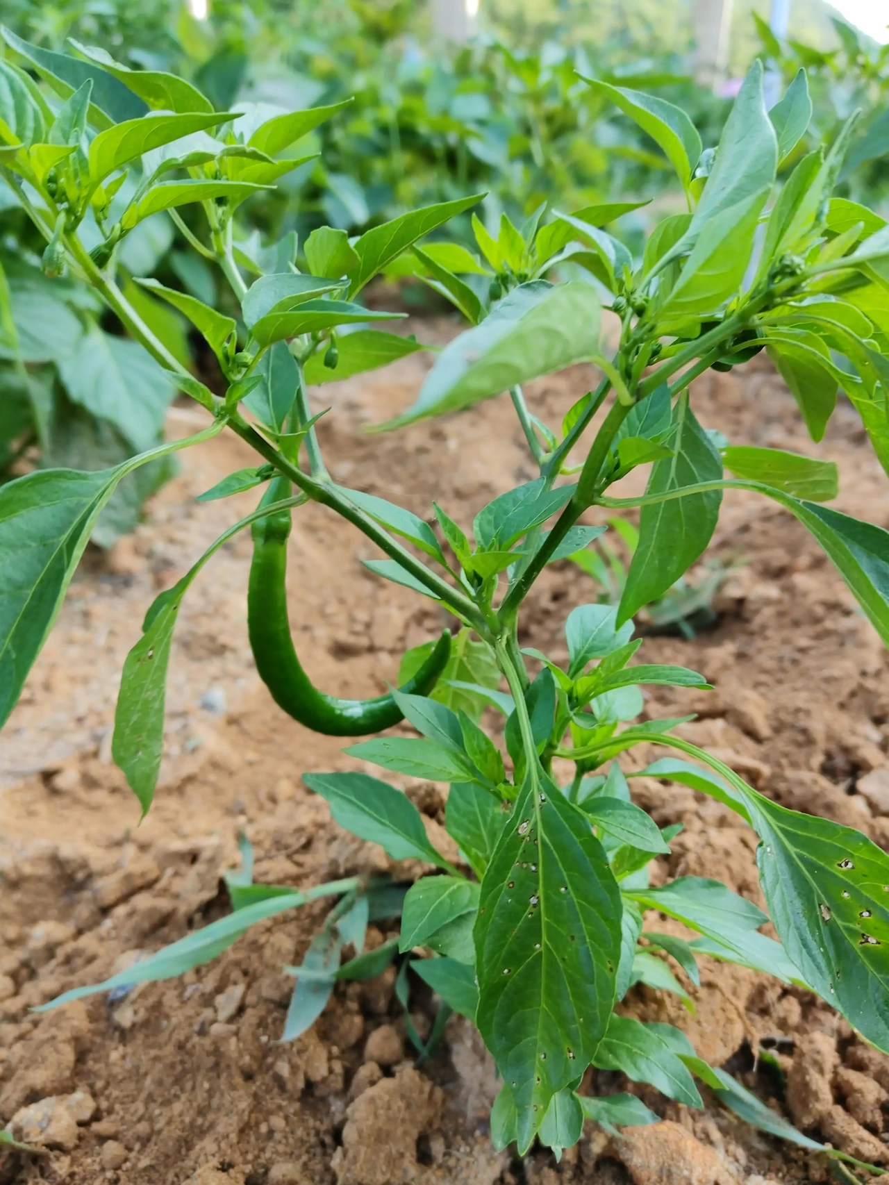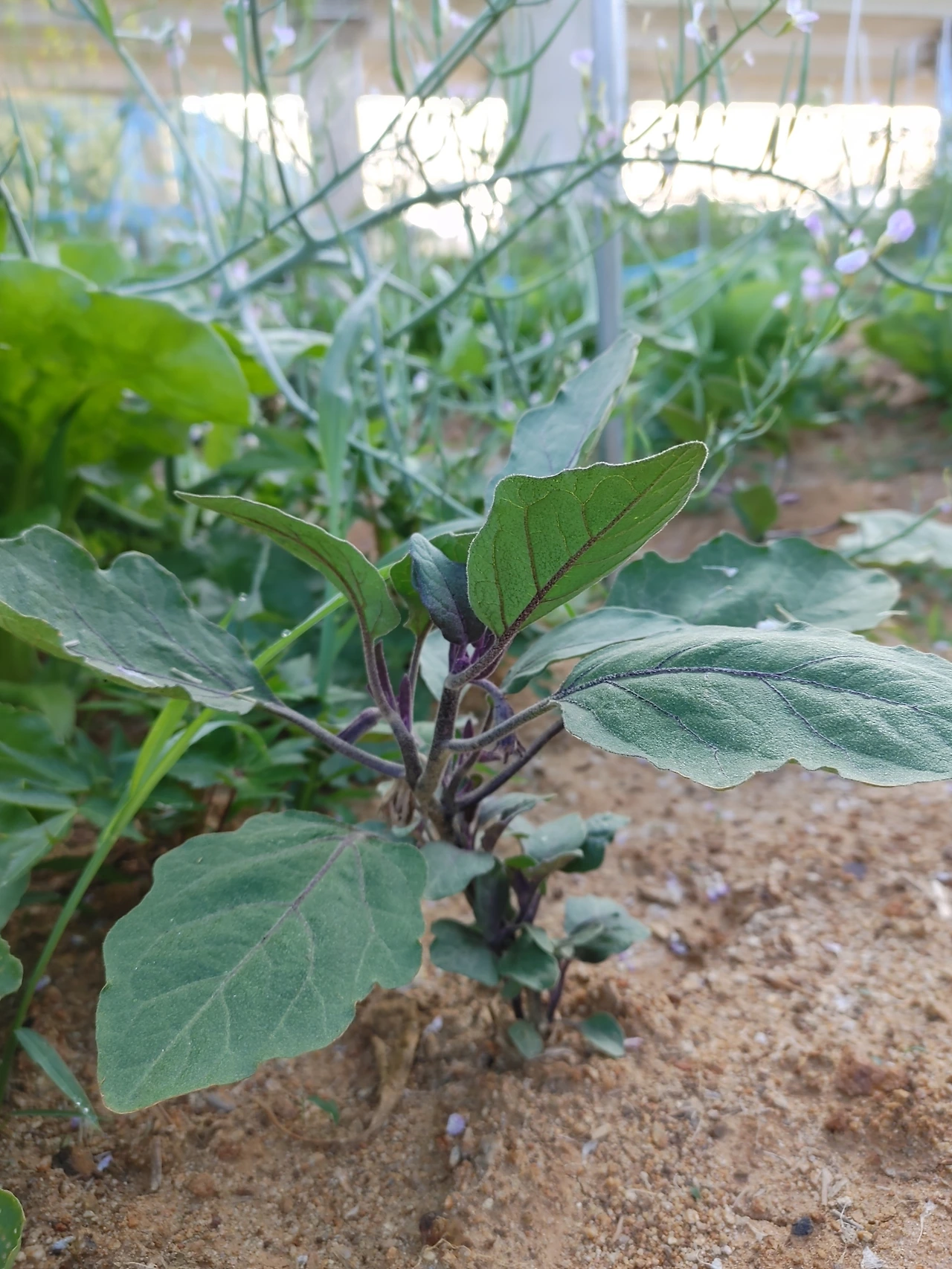 다른 곳으로 눈을 돌려보았다. 열매채소인 고추, 가지, 토마토에도 꽃이 피었다. 고추는 하얀 꽃, 가지는 보라꽃, 토마토는 노란 꽃이다. 모종을 심을 때부터 꽃이 피었던 고추에는 열매가 몇 개 달렸다. 고추와 가지는 파종시기가 늦어서 그런지 많이 자라지는 못했다. 이웃 농부의 것은 성인이라면 우리 것은 초등학교 수준밖에 되지 않는다.