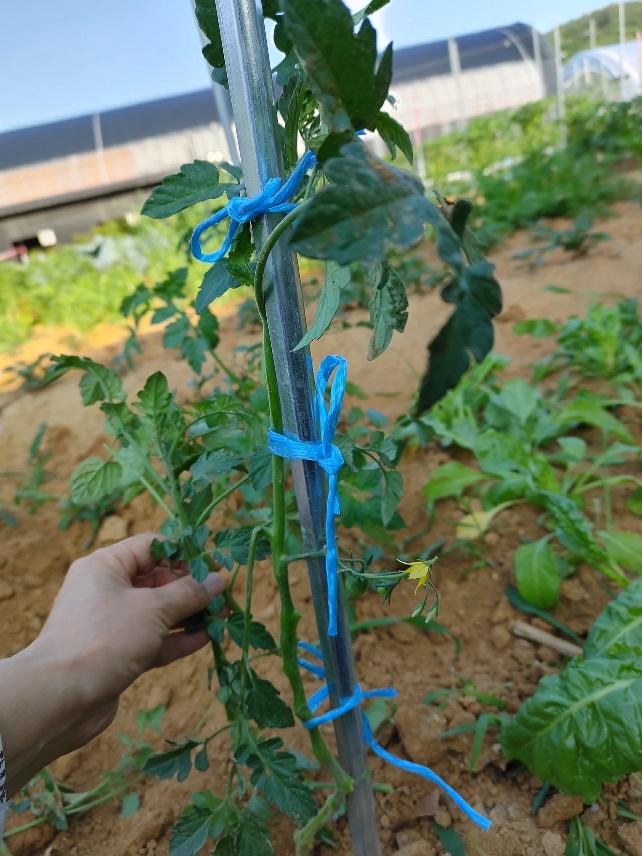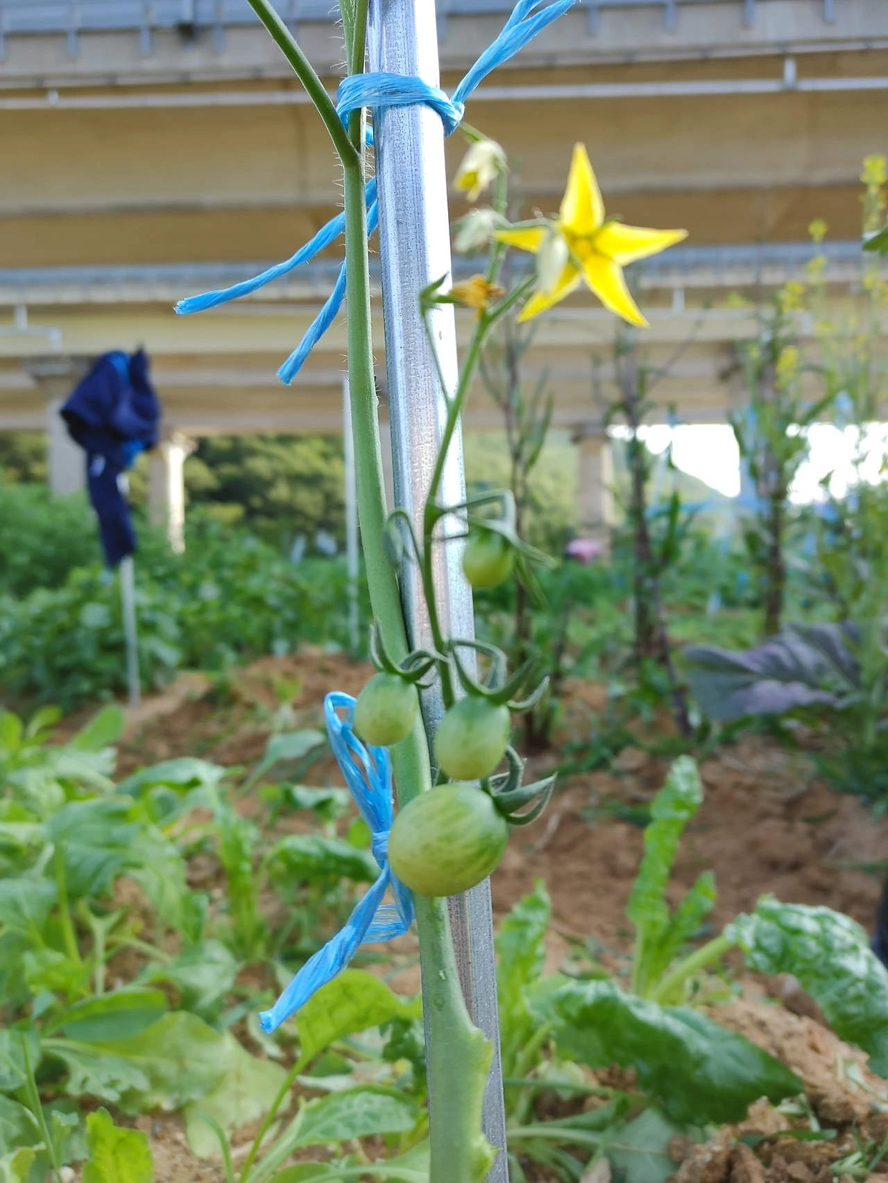 토마토도 벌써 여러 개의 열매가 열렸다. 토마토 역시 파종시기가 늦었지만 그래도 줄기가 많이 자랐다. 어머. 실수로 토마토를 잘못 다뤄 토마토가 떨어졌다. 토마토는 줄기의 아랫부분은 따주고 중심 줄기만 키운다. 토마토 줄기를 너무 많이 남기면 제대로 된 토마토를 보기가 어렵다. 토마토는 지지대를 잘 세우고 끈으로 묶어서 위로 잘 향하도록 해주어야 한다. 지난번 세워두었던 지지대에 파란색 끈으로 묶어주는 작업을 했다.