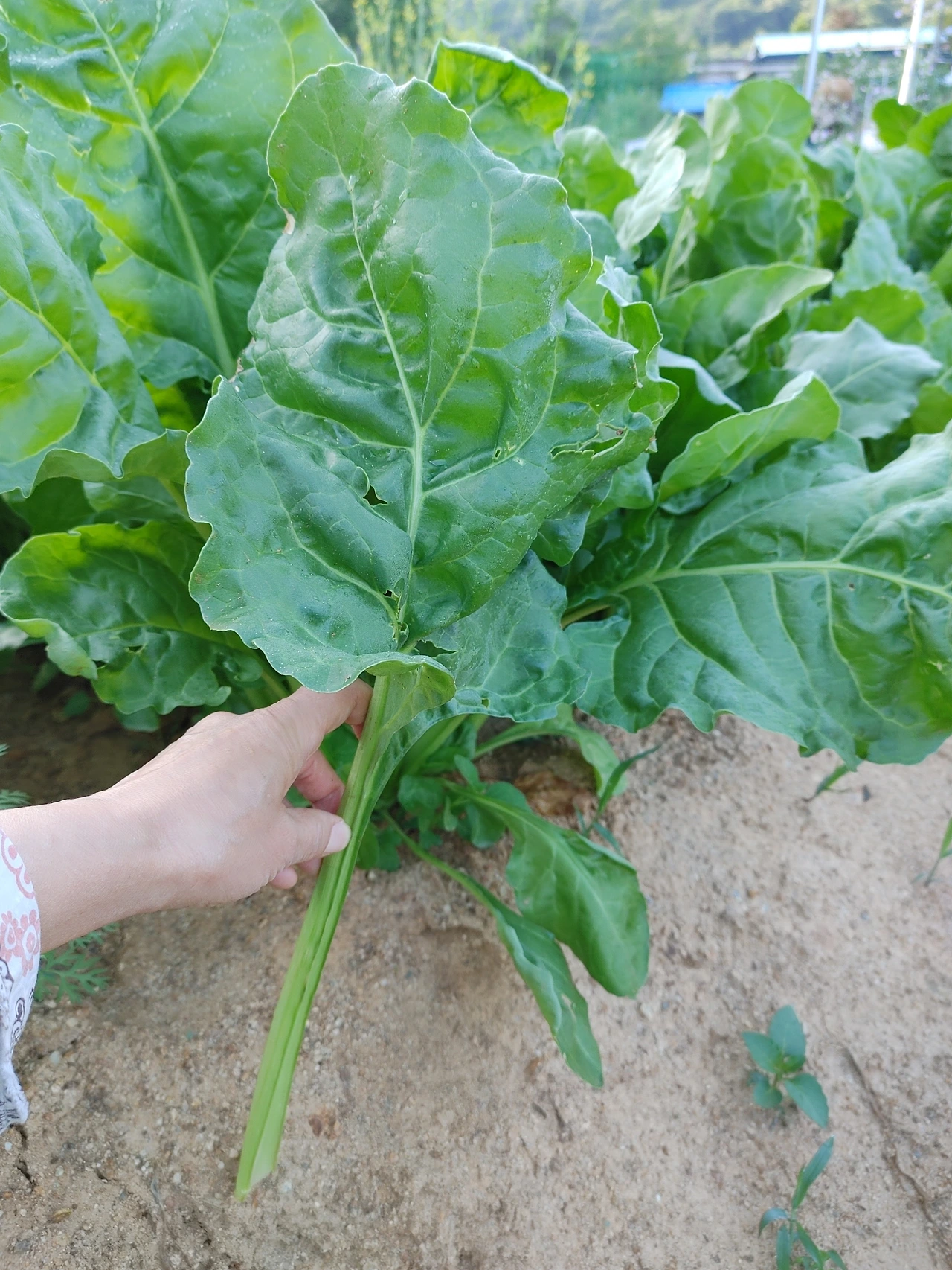 당근 옆에 근대를 보고는 정말 깜짝 놀랍다. 여린 시금치 같던 모습은 사라지고 배춧잎만 한 크기로 자랐다. 근대는 내손으로 사서 먹어본 적도 없고 키워 본 적도 없어서 자라는 모습이 더 신기했다. 근대를 수확하는 방법은 상추처럼 밑에서 줄기를 하나씩 바짝 따주면 된다. 한 잎 딸 때마다 서걱서걱한 소리가 들렸다. 친정어머니가 근대를 좋아하신다는 지인을 생각하며 많이 나눠줄 수 있을 것 같아서 마음이 흐뭇하다. 근대는 된장국을 끓여도 좋고, 살짝 대쳐서 무쳐 먹어도 맛있다. 근대 줄기의 아삭 거림이 참 맛나다.