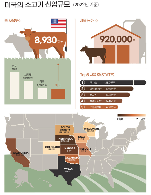 22년 기준 인도, 브라질, 미국에 이어 4번째 사육을 많이 하는 국가이며, 텍사스주, 네브래스카주, 캔자스주, 캘리포니아, 오클라호마의 주요 5개 사육지역에서 40%의 사육을 하고 있는 것으로 보입니다.