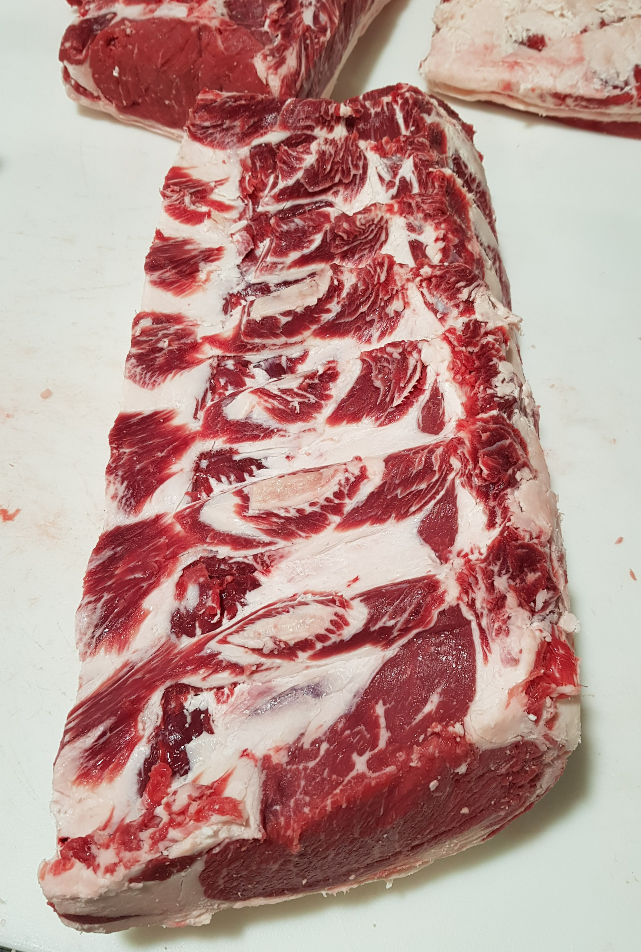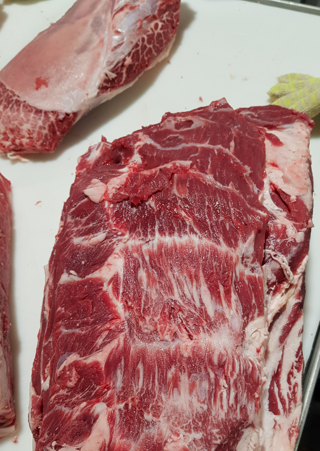 MD들은 출장을 가게 되면, 수입되는 고기의 스펙을 중심으로 확인합니다. 소고기의 경우 어느 곳에서 칼로 절단하느냐에 따라 원물의 가격은 차이가 많이 나기 때문입니다. 우리가 쉽게 알고 있고, 많이 먹는 부채살(Oyster blade)도 상단부문과 측면에 앞다리의 살들을 포함하여 절단하면 가격이 낮아지지만, 막을 따라 부채살의 근육만을 정형하면 가격은 많이 비싸집니다. 빠른 정형의 속도를 감안하면 막을 따라 정확하게 정형하는 것 자체가 어려울 수 있습니다. 척아이롤(목심+윗등심)의 부위 또한 목심을 어느 정도 포함하고 있느냐와 측면을 어느 정도 부착하느냐에 따라 가격의 차이가 많습니다. 전용스펙을 요구하여 반영되기도 하지만, 대게는 그 가공장에서 생산하고 있는 다양한 스펙의 범위에서 합리적인 스펙을 선택하는 경우가 많습니다.