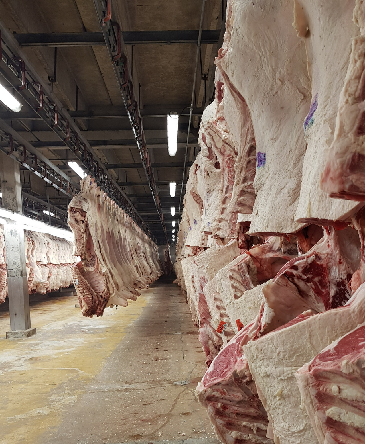 생체가 도축장에 도착하면, 타격 -> 방혈 -> 외피제거 -> 내장적출 -> 2분 도체 -> 냉각 -> 발골 -> 정형 -> 포장 -> 박스 등의 공정을 거치게 됩니다. 2분 도체로 분할된 지육은 냉각(15~24시간 내외)의 과정을 거쳐야 발골하기 적당하며, 등급을 판정하기 좋은 상태가 됩니다. 지육 보관실은 여유 있는 공간을 주어야 냉각의 속도가 빠른데, 방문한 가공장은 여유 있는 공간으로 적정하게 냉각할 수 있는 구조를 보유하고 있었습니다.