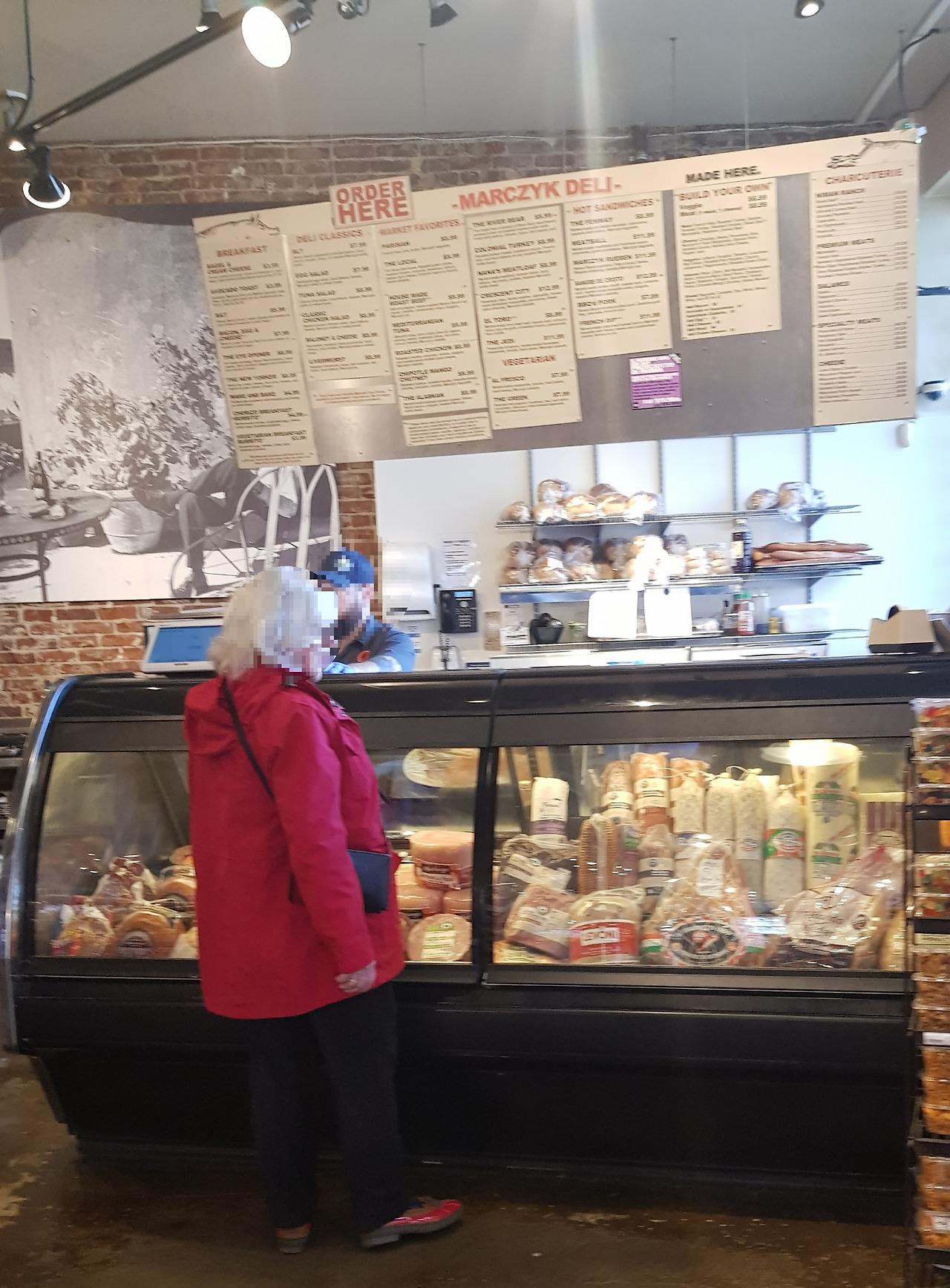 빵을 구매하시고, 빵과 함께 먹을 치즈를 구매하시는 것 같습니다. 치즈와 본인햄, 본레스햄의 두께와 필요한 양을 주문하면 즉석에서 썰어주는 코너인 것 같습니다. 국내에서는 슬라이스 된 가공상품을 구매해서 샌드위치 혹은 빵 사이에 넣어서 먹는 것이 일상 적이지만 미국의 로컬푸드마켓에서는 덩어리를 직접 주문하고 필요한 만큼 구매하는 코너를 자주 볼 수 있습니다. 빨간색 점퍼를 걸친 노인네에서 우리네 어머니들의 쇼핑하는 모습이 교차되는 것은 구매하는 형태가 다를 뿐이지 똑같은 마음이지 않을까? 하는 삶의 모습이 느껴집니다.