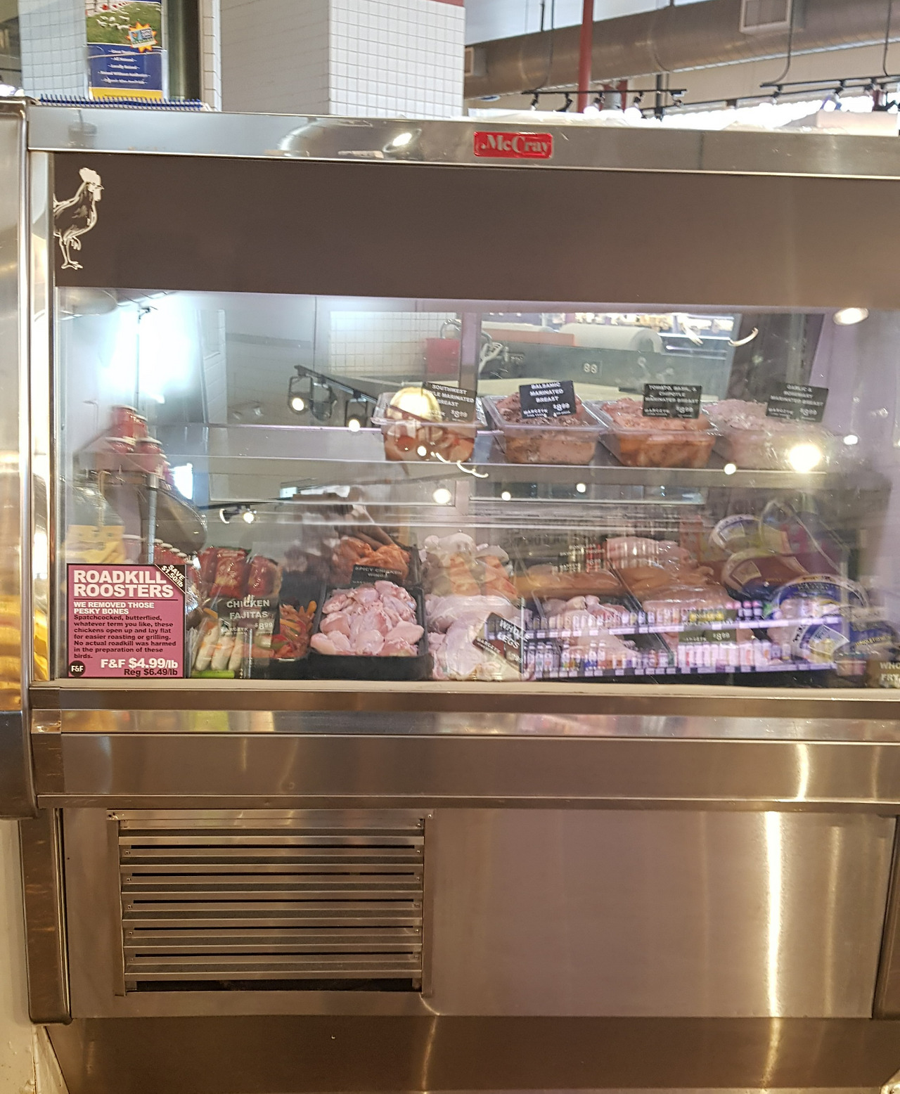 고기를 주재료로 사용하는 식문화답게 대면형 쇼케이스 3개가 설치되어 있습니다. 냉장 닭고기가 벌크로 진열되어 있으며, Seasoned Meat가 진열되어 있습니다. 간편한 조리로 바비큐를 해 먹을 수 있는 상품입니다.