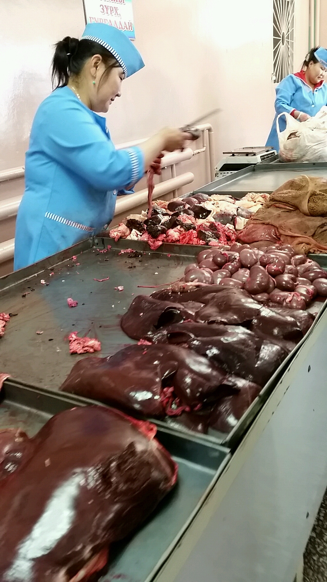 돼지고기를 판매하고 있는 판매장입니다. 몽골의 지육분할 기준을 확인해 보긴 하였으나, 우리나라의 지육분할 방식과는 다르기에 이해하기가 쉽지는 않았습니다. 우리나라의 경우 돼지의 경우에도 뼈를 포함하고 있는 소분할로는 갈비만 있고, 나머지는 뼈와 살을 분리하는 방식인데 몽골의 경우는 뼈를 포함하고 있는 덩어리육으로 판매하는 것이 많았습니다. 아마도 뼈를 포함한 요리가 많은 듯싶기도 하고, 칼을 잘 다루는 민족답게 원하는 데로 정형하는 것도 어렵지 않을 것 같단 생각이 들었습니다. 상온에 노출이 되어 있긴 하지만 상품의 색상 및 선도는 우수했습니다. 아마도 도축된 지 얼마 안된 듯 싶습니다.