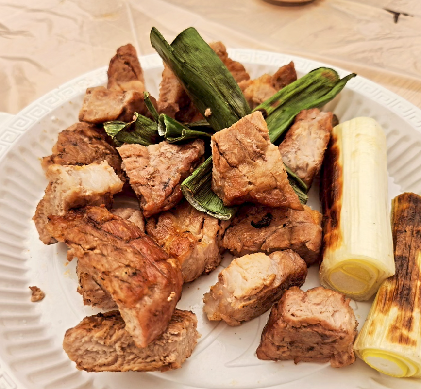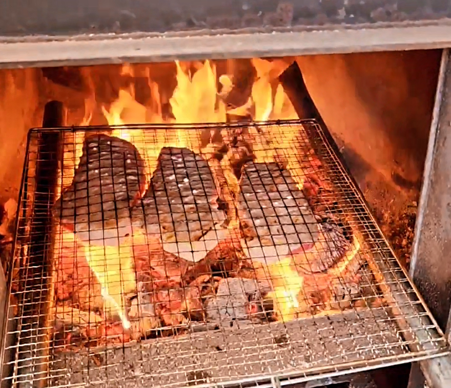 삼겹살과 목살을 장작불에 맛나게 굽고 있었다.