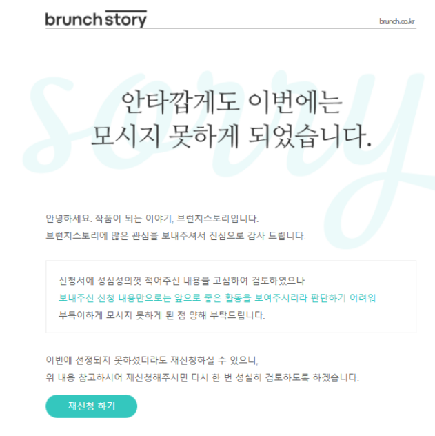 브런치 작가 불합격 메일이다. 안타까운 일이다.