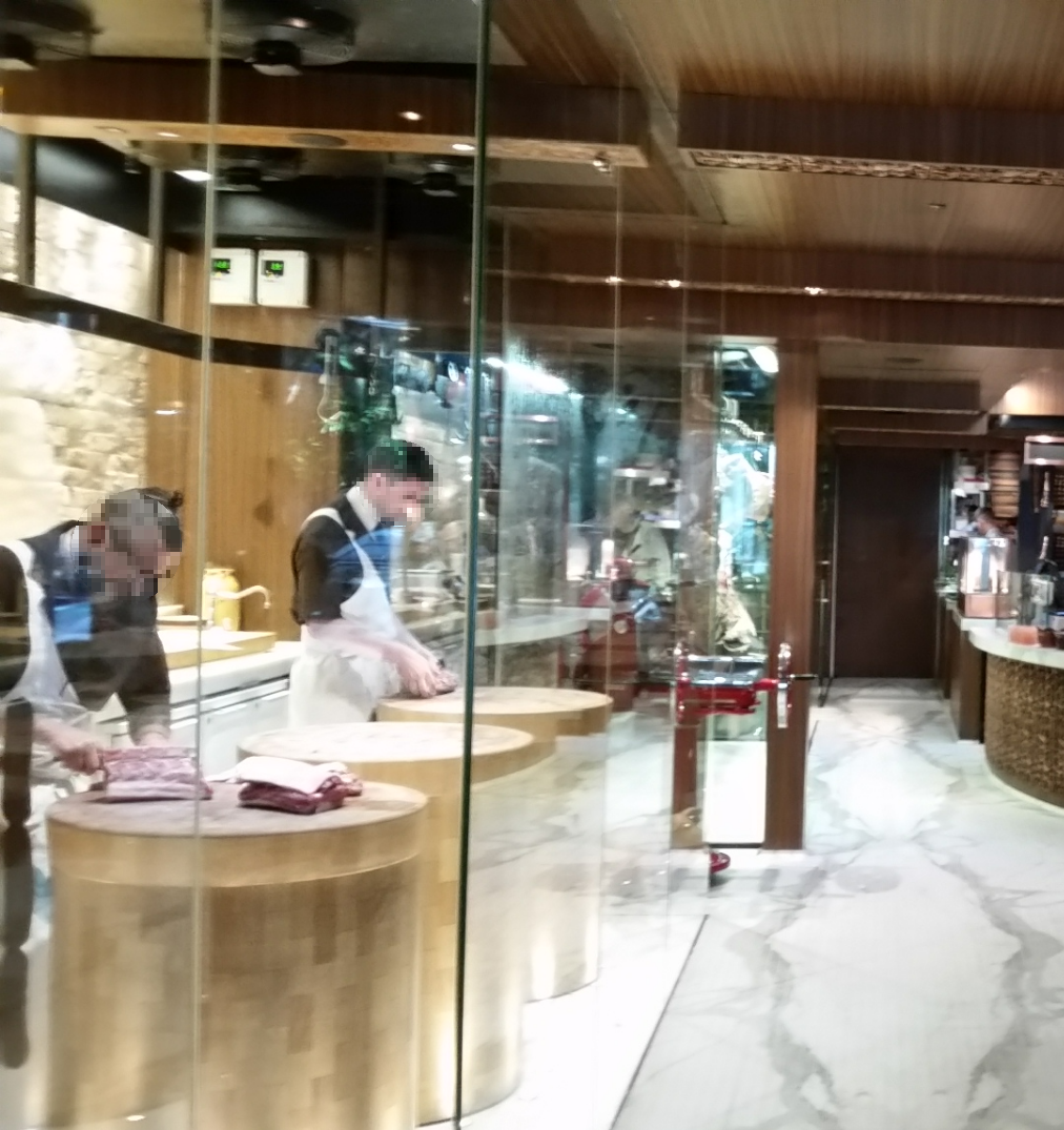 좌측의 길게 뻗은 유리로 된 작업장에는 은은하게 불빛을 비추는 원형도마가 3개 자리 잡고 있었으며, 양고기와 드라이에이징을 전문가가 직접 손질하는 모습을 볼 수 있었습니다. 작업하는 직원들은 맨손으로 고기를 만지고 있었습니다. 맨손으로 뼈와 고기를 분리하는 작업은 상당히 위험합니다. 손질하는 사람이 웬만한 전문가가 아니면 다칠 확률이 높습니다. 그들의 작업모습은 "잔잔한 감동"이었습니다.