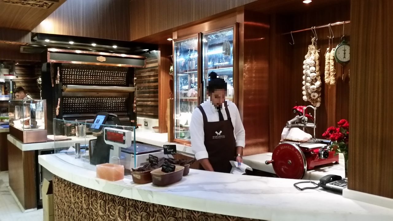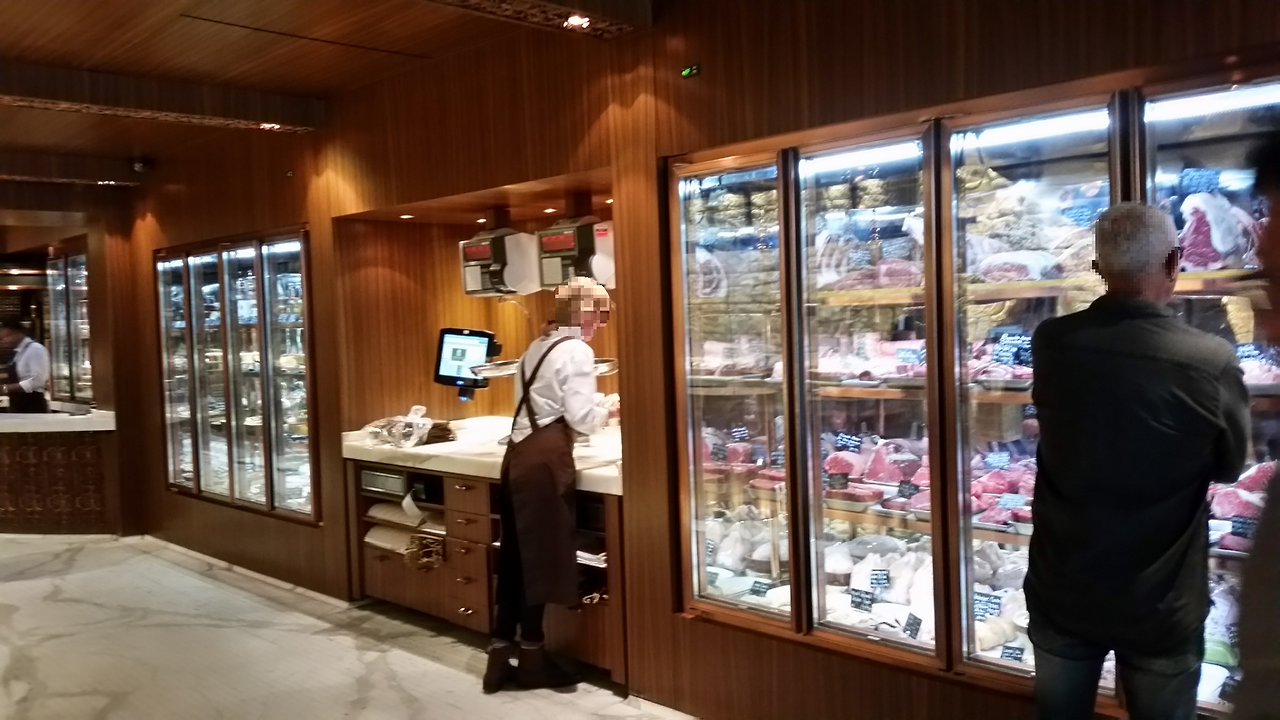 계산대도 특이한 점이 있었는데, 저울이 천정형 저울이었습니다. 천정형 저울 모습도 빈 공간을 활용한 Display 효과를 충분히 나타내고 있었습니다. 상품이 들어있는 냉장고는 모두 밀폐형으로 설치되어 있었고, 상품의 보관에 있어서 온도가 일정하게 유지되는 효과를 나타내고 있었습니다. 밀폐형 판매대에 진열되어 있는 Bone in Meat와 Cured Meat(염지육 또는 가공육)의 진열도 상당히 인상적이었습니다.