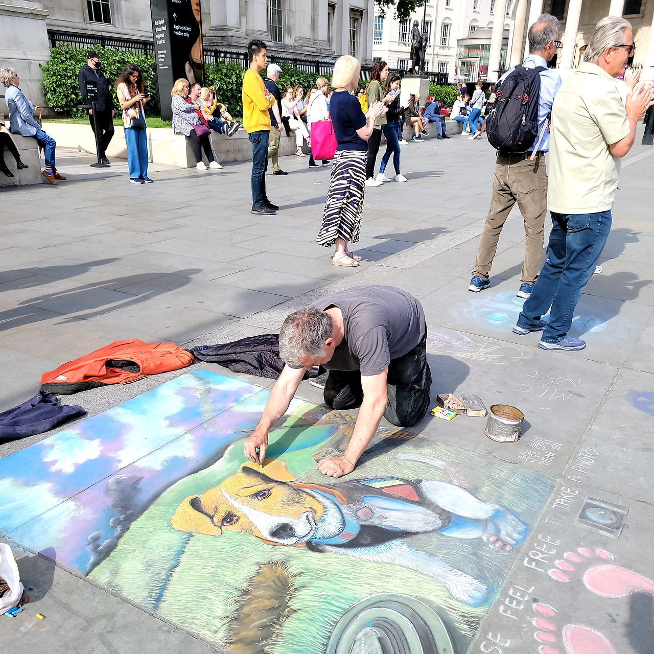 트라팔가 광장 "넬슨제독 동상""거리의 음악가"가 부르는 노래를 잠시 멈추어 들어 보았습니다. 강아지를 그리고 있는 "거리의 화가"를 보았습니다. 돈을 넣는 통이 놓여있었습니다. 아마도 가난한 예술가 인가 봅니다.
