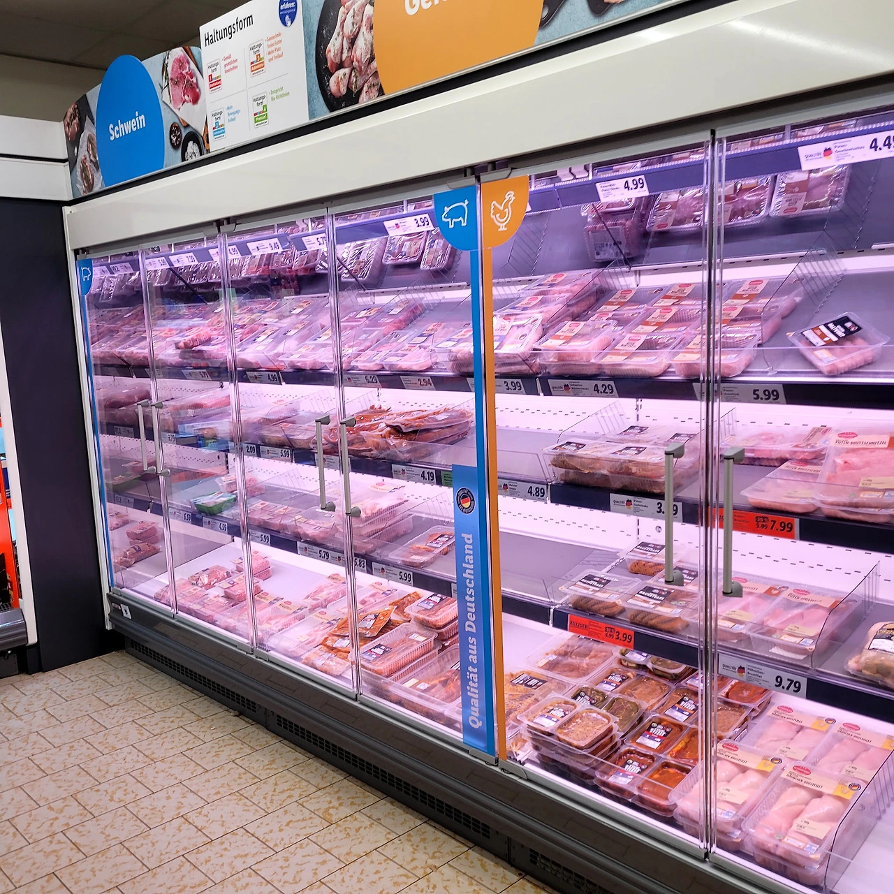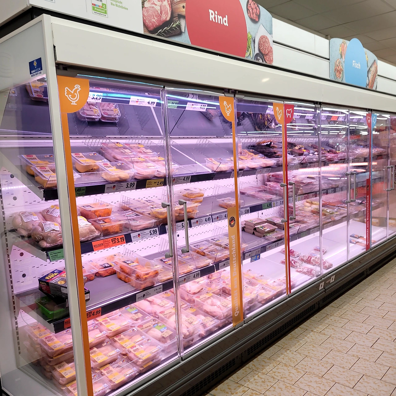 고기와 시즌드미트는 RRP 박스를 사용하지 않고, 낱개의 상품으로 진열되어 있었습니다. ESG 경영의 실천으로 냉장진열대는 모두 밀폐형이었습니다. 밀폐형 투명문에 돼지와 닭의 표시를 하여 섹션을 구분하는 아이디어는 좋은 것 같습니다.