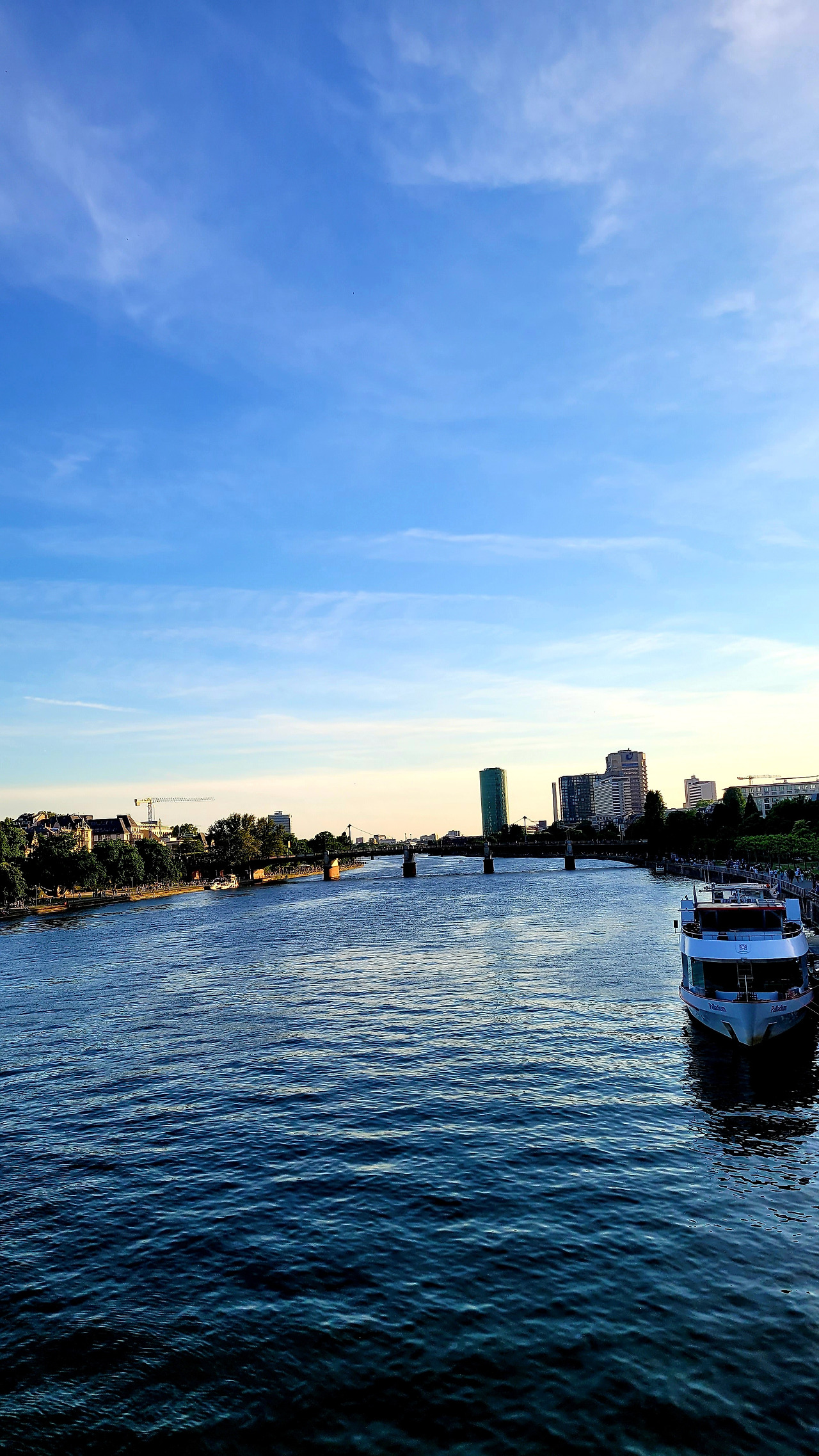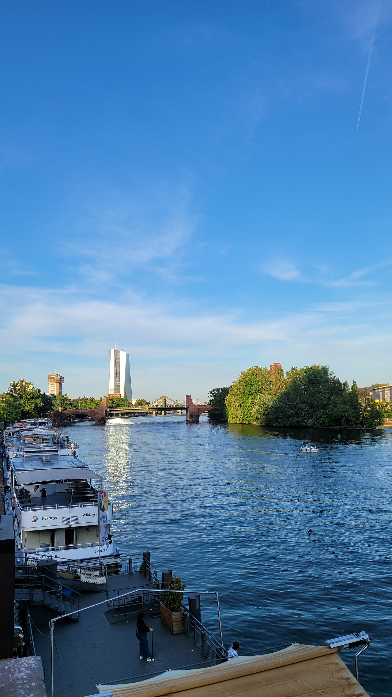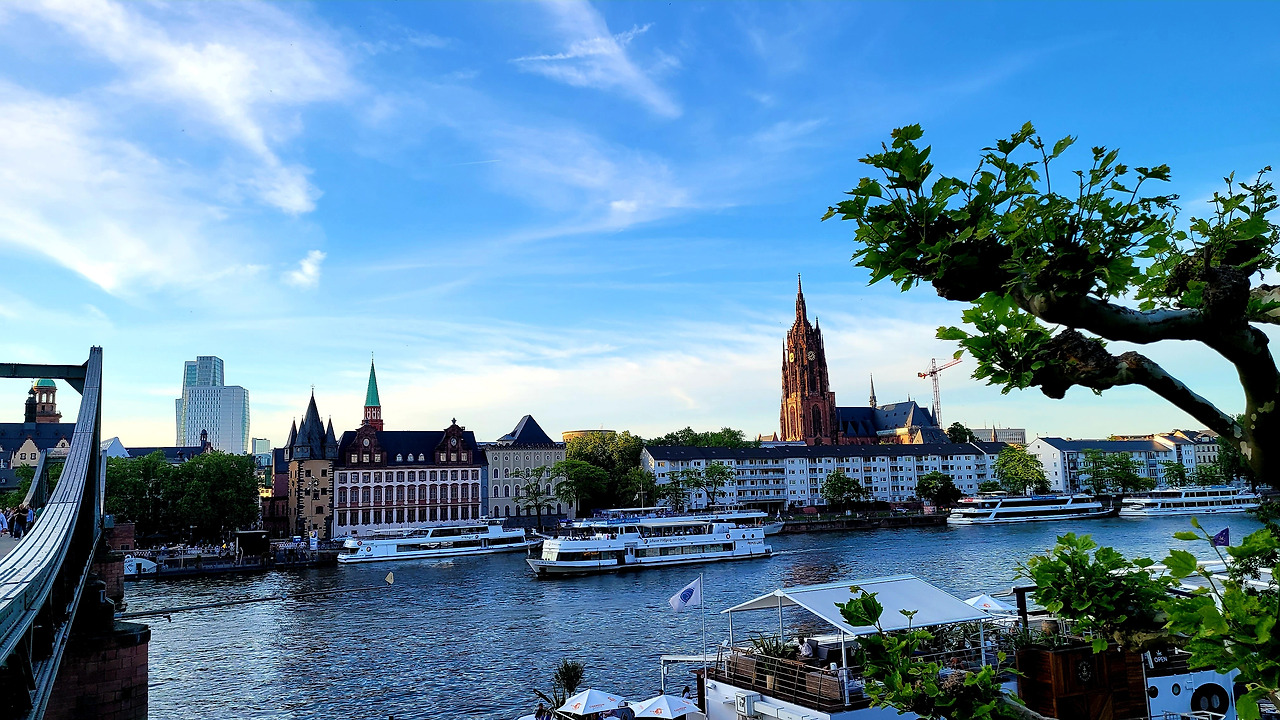 중세와 현재가 어우러진 뢰머광장을 지나, 프랑크푸르트의 중심을 가로지르는 마인강에 도착했습니다. 마인강에 띄워져 있는 유람선과 선상카페는 그지없이 평화로웠습니다. 날이 좋아서인지 물의 빛깔도, 하늘의 색상도, 너무나 조화롭습니다.