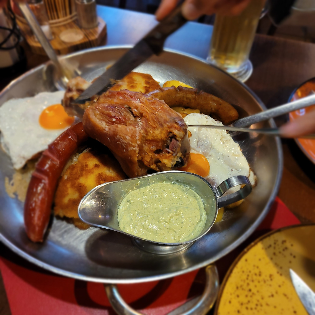 "뢰머광장" 근처의 맛집 12 사제들(Apostles)을 방문했습니다. 제가 좋아하는 독일 정통소시지와 슈바이학센을 안주로 맥주를 한 잔 하기로 했습니다. 슈바이학센은 독일식 돼지족발요리라 생각하시면 될 것 같습니다. 맛의 특징은 "겉은 바삭, 속은 촉촉"입니다. 맛있습니다. 방문하실 것을 추천드립니다.