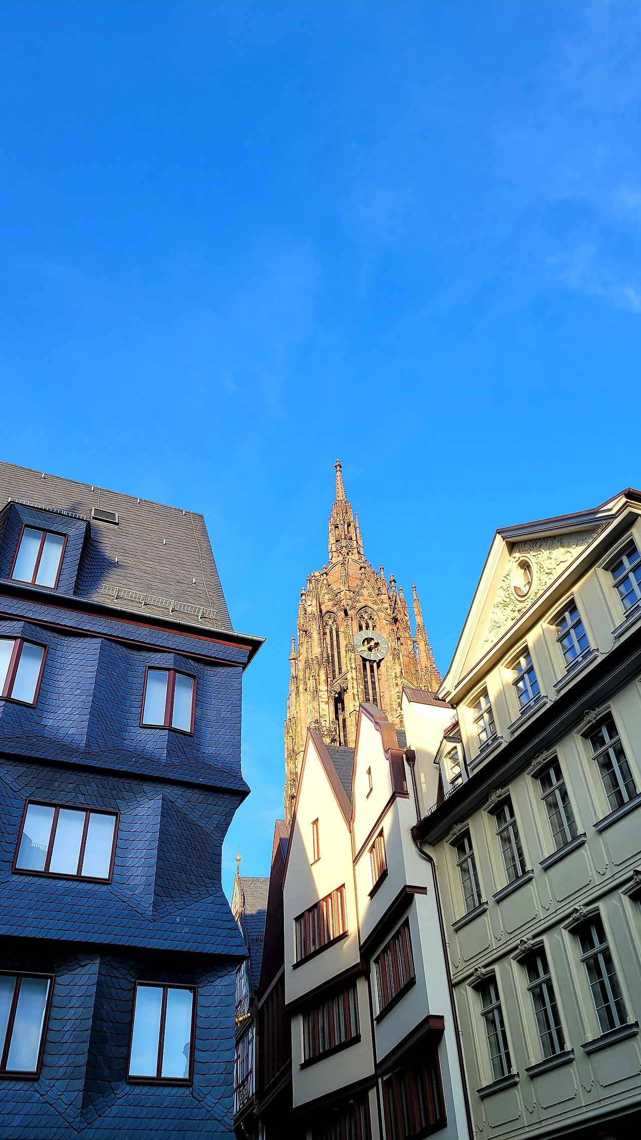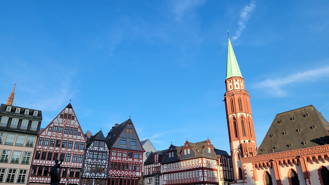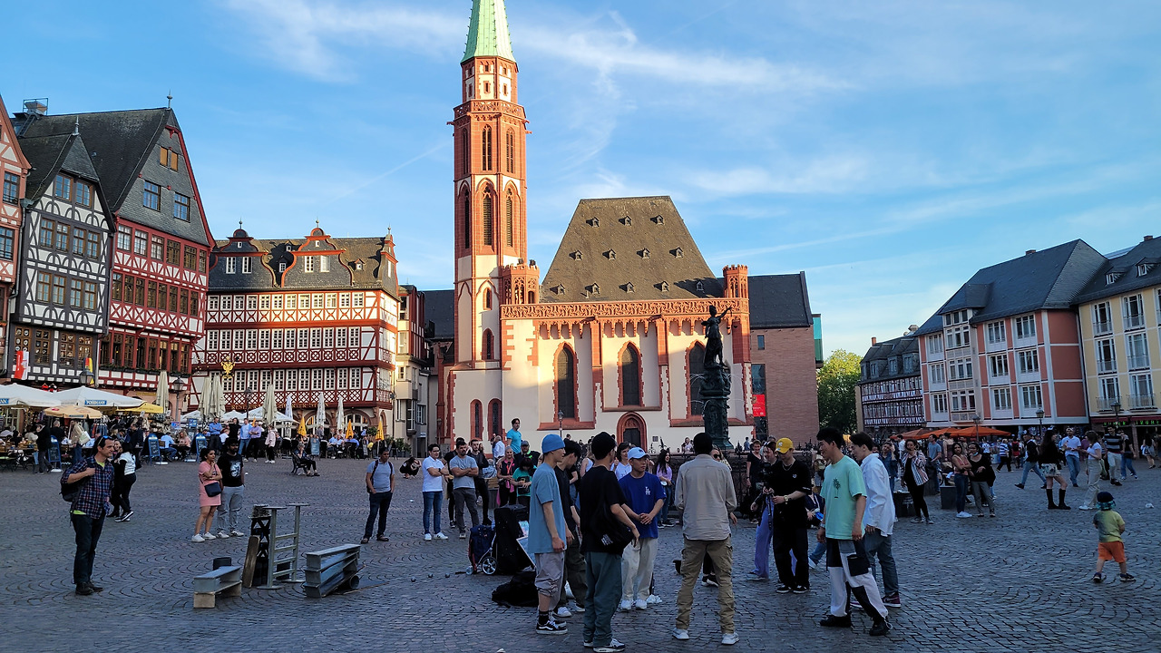 건물들 사이로 보이는 성당은 "프랑크푸르트 대성당"입니다. 프랑크푸르트 대성당은 1239년에 완성되었으며, 95m의 규모입니다. 1562년부터 230년 동안 신성로마제국의 황제를 선출하고, 대관식이 열렸던 장소라고 합니다. 황제의 대관식이 열린 장소라 하여 황제의 성당(카이저돔)이라 불린다 합니다.