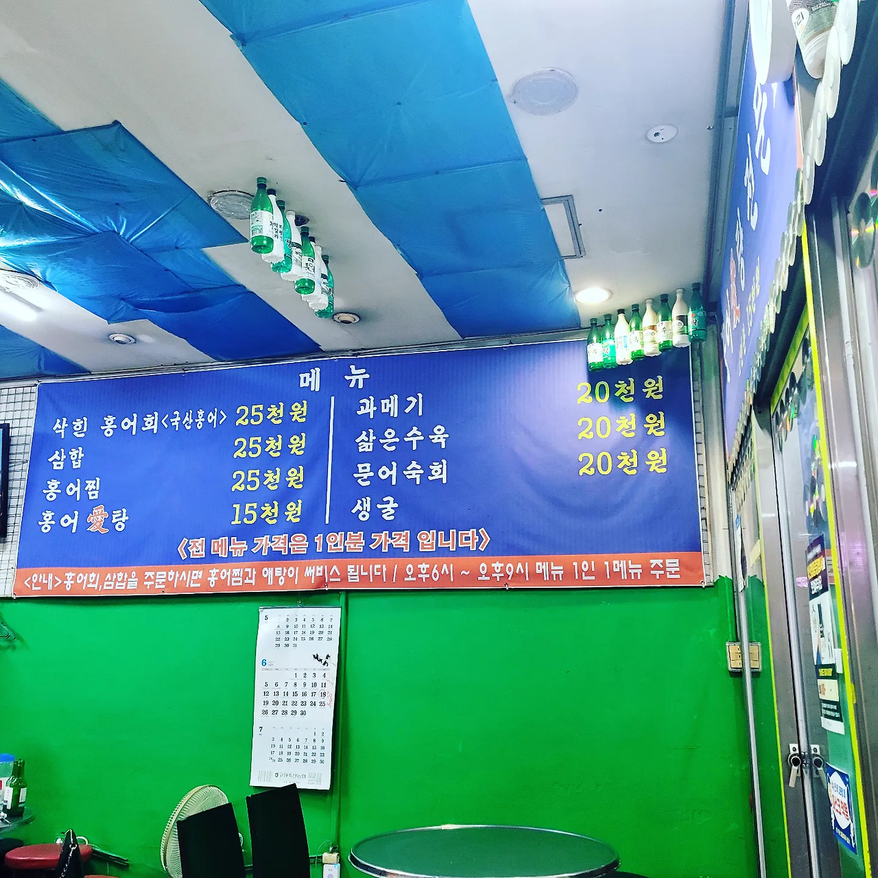 식당에 들어서서 자리를 잡고 앉았다. 역시 홍어집 느낌 나는 식당이네, 천장에는 막걸리병이 붙여져 있고, 메뉴판도 단순하게 현수막 1장에 표현되어 있다. 홍어삼합 2인분을 시키면 홍어찜과 애탕을 서비스로 준다네요.