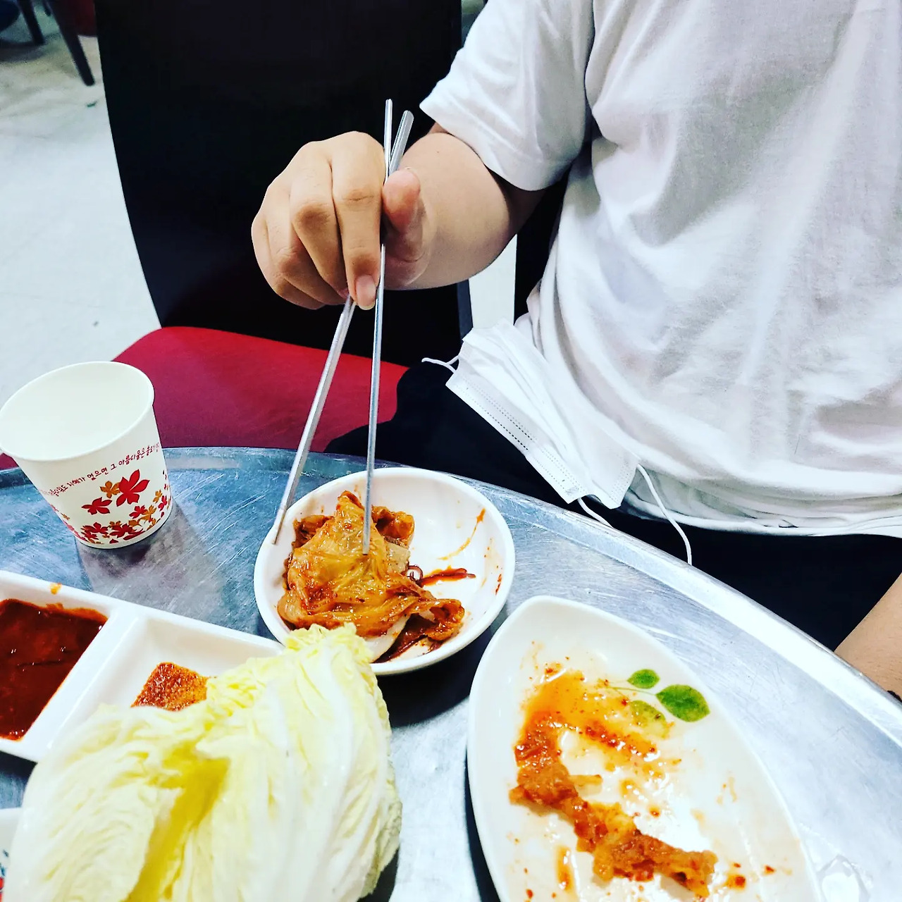 "어, 삼겹살 수육 정말 맛있는 것 같아~, 다음엔 엄마와 누나도 같이 와서 먹어볼까?"