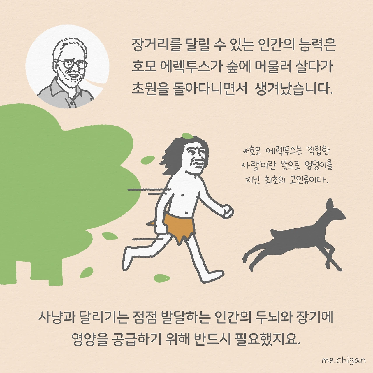 나는 이미 달리지 않으면 엉덩이가 사라질 나이가 되었다. 운동하지 않으면 배는 점점 튀어나오고 엉덩이는 납작해질 것이다. 솔직히 말하면 이미 경험한 적도 있다. 그러면 떡 벌어진 어깨에 털만 복슬복슬 남아서 고릴라처럼 보인다. 달리기를 끊으면 나는 최소한 신체적으로는 퇴보하여, 큰 엉덩이가 있다면 결코 그렇게 진화하지는 않았을 영장류의 모습으로 회귀할 것이다. 이런 의미에서 달리기는 내 속의 분명한 인간적 특성인 큰 엉덩이적 인간성을 유지하는 방법이다.