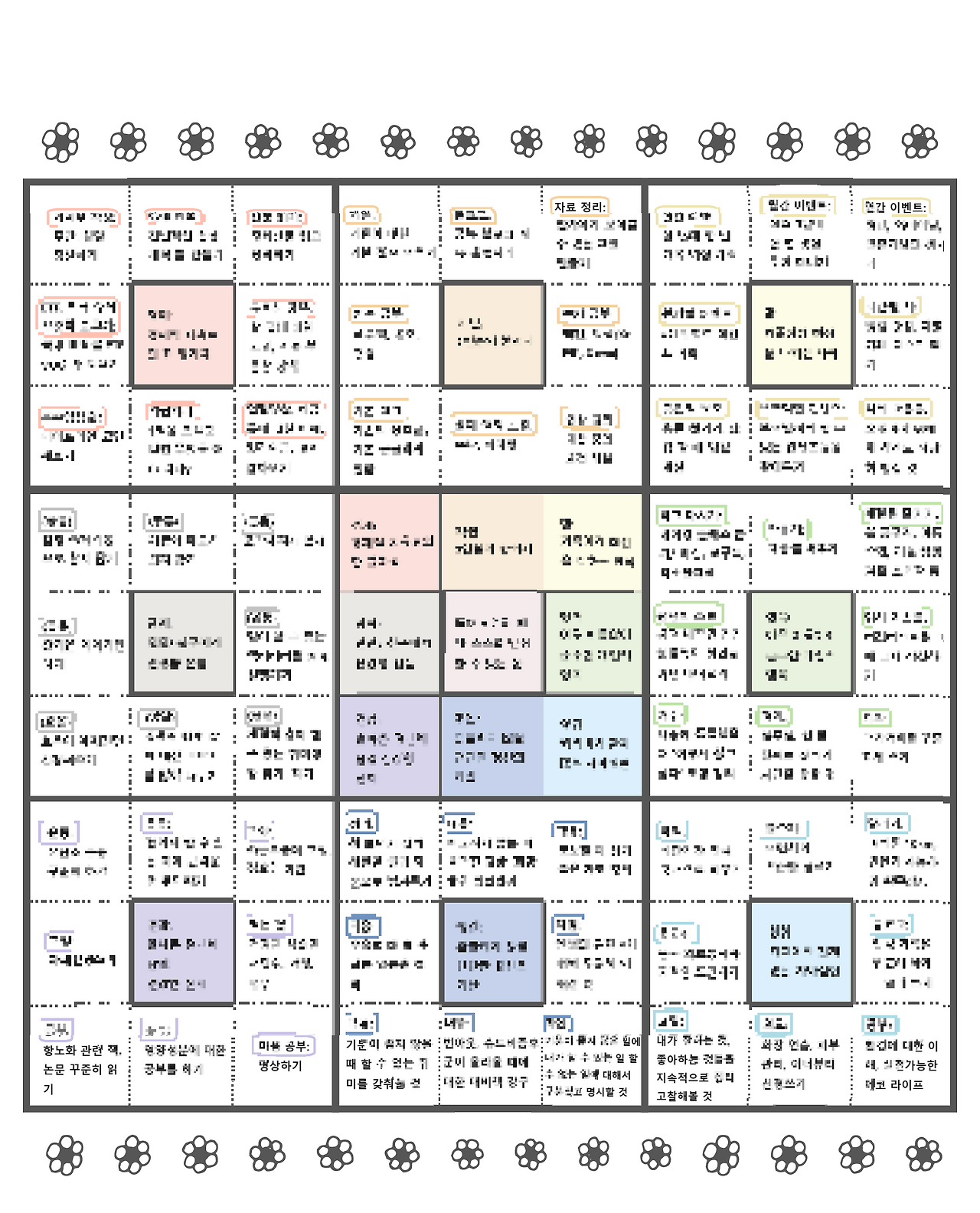 그러다 올해는 연초에 시험이 있어 연말부터 쭉 숨 가쁘게 공부를 해야 해 이런 설렘을 미처 누리지 못했다. 시험이 끝난 뒤로 미뤄야지, 미뤄야지 하다가 오늘이 왔다. 저녁 식사를 든든히 하고 제일 좋아하는 텀블러에 따뜻한 디카페인 페퍼민트 차를 타서 방으로 들어온다. 작년과 올해의 다이어리를 모두 펼치고 에버노트 창을 켜 작년 말에 조금씩 작성해 온 만다트라 이미지를 꺼내본다. 올해는 이직이 끼어있고 생각처럼 직장 구하기가 쉽지 않아 그 과정에서 마음의 상처도 많이 입어 예년과 달리 두려움을 기반으로 시작하게 되었다. 불확실성을 무서워하는 나에게 당장 다음 달부터 백수가 되는 지금이 달갑지만은 않다. 쉼이란 게 이렇게 불안한 거였을까, 나름 평생 쉼표 없이, 단 한 번의 휴학이나 한눈팔기 없이 정해진 코스대로 살아온 나에게 지금 이 상황 자체가 매우 큰 도전이라 할 수 있다. 이럴 때일수록 더더욱 계획에 몰두하기. 어쨌든 흘려보내야 하는 시간에 그냥 지나갔다, 로 남기지 않기 위해 차근차근 또 계획을 세워본다. 이 시간만큼은 불안에 떨며 보내지 않을 수 있으니 말이다. 힘내자!