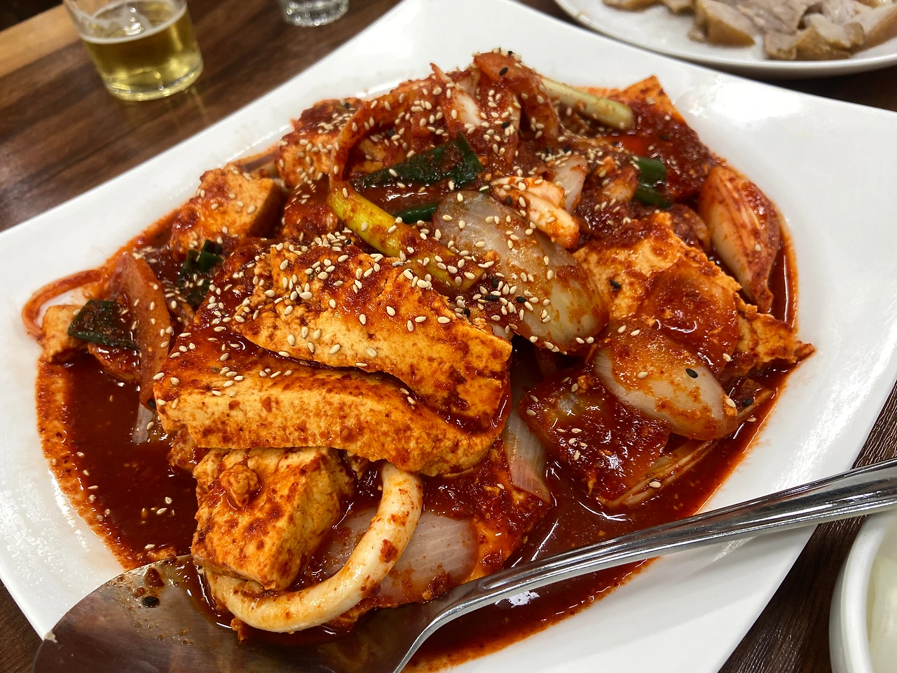 수육을 소자로 참고 이번에 새롭게 시킨 메뉴. 바로 오징어 두부 치기. 여기에 나중에 사리를 추가해 먹어도 좋은데, 두 명이서 가게를 찾으니 그렇게까지 시켜 먹지 못하는 게 마음 아프다.