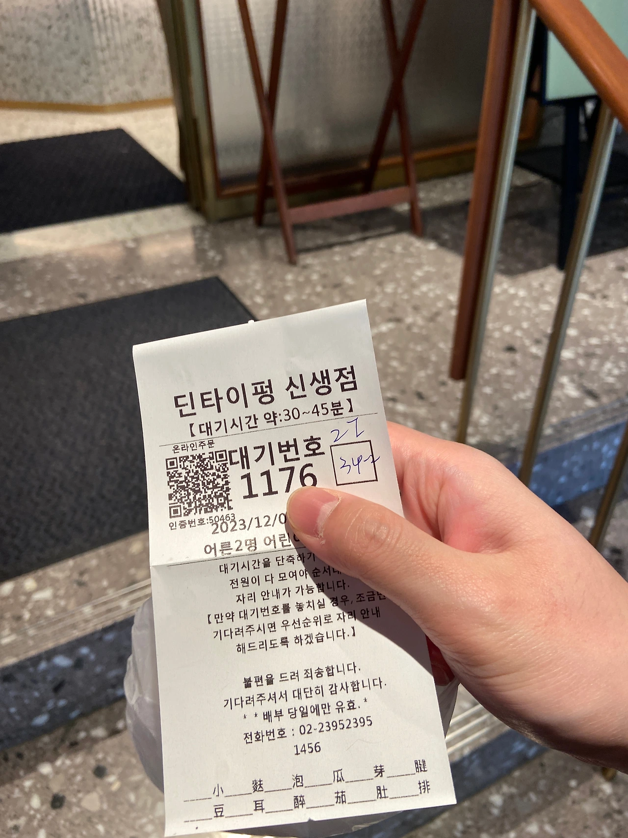 웨이팅 방법은 이미 알고 있을 듯하다. 어슬렁어슬렁 가게 앞의 안내 종업원에게 가면 그냥 바로 한국어로 웨이팅을 잡아준다. 그러면 웨이팅 번호를 알려주고 가게 바로 앞에 전광판에 나온 숫자를 보면서 내 번호가 뜨면 바로 가서 종이를 보여주고 입장을 하면 된다. 입장을 할 때가 되면 원래는 빈칸이었던 저 네모박스에 내 테이블 넘버를 적어주니 식당에 들어가서 그곳의 종업원에게 또 보여주면 친절히 자리까지 안내해 준다.