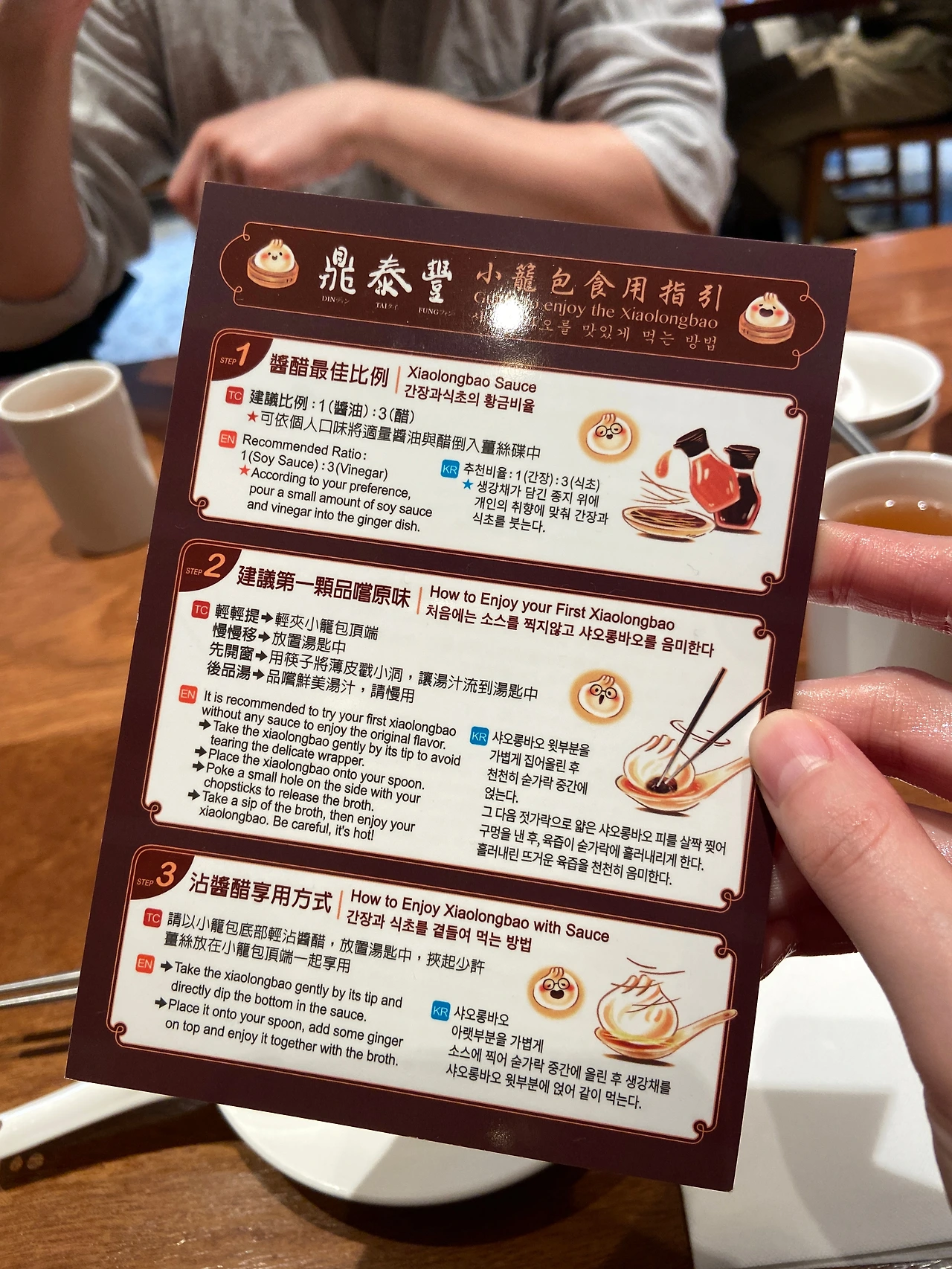 총좌빙(蔥抓餅)도 사 먹고 이따가 다시 와서 들를 가게들도 눈으로 도장을 찍어둔 뒤 어플을 확인해 딘타이펑에 입장했다. 친절한 종업원분들의 안내를 받으며 자리로 안내받기. 주문은 미리 QR 코드로 넣어뒀기 때문에 그냥 앉아서 기다리면 된다. 테이블에는 이렇게 다양한 국가의 언어로 딘타이펑의 대표 메뉴, 샤오롱바오(小籠包)를 먹는 법을 설명해주고 있다.