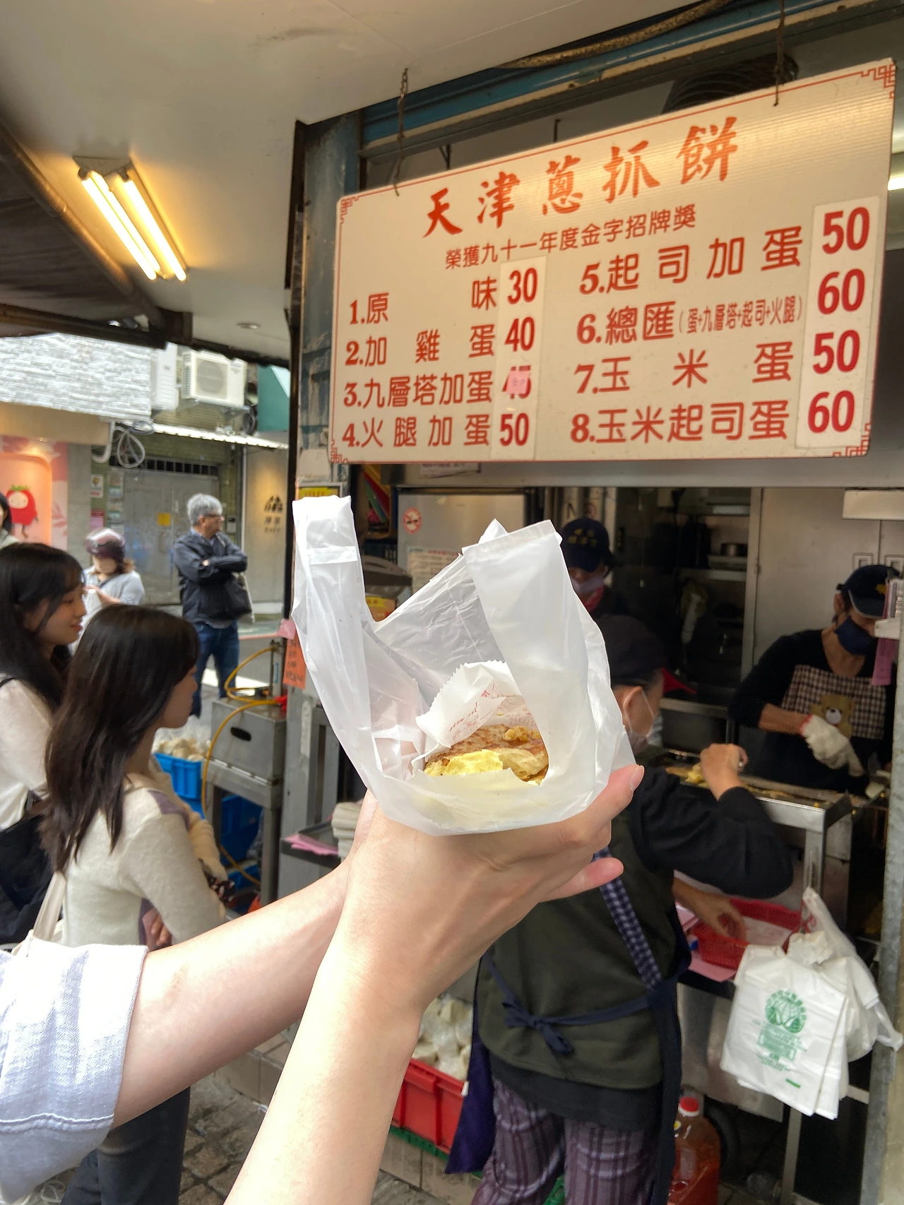 융캉제(永康街)로 가 그 유명한 텐진총좌빙(天津蔥抓餅)을 먹는 것! 이것도 금방이지만 거의 반드시라고 해도 좋을 만큼 웨이팅을 해야 하기 때문에 웨이팅 속에 웨이팅을 하는 시간 절약을 할 수 있다. 그리고 딘타이펑을 계획삼을 때 이 텐진총좌빙(天津蔥抓餅)도 같이 묶음으로 일정을 잡기가 좋은데, 이거 하나로는 당연히 식사가 되지 않아 딘타이펑 식전의 애피타이저도 먹기도 아주 그만이다. 두 명이서 하나를 먹어도 좋고 먹성이 좋다면 인당 하나씩 먹어도 그만이다.