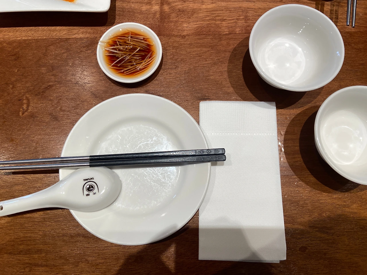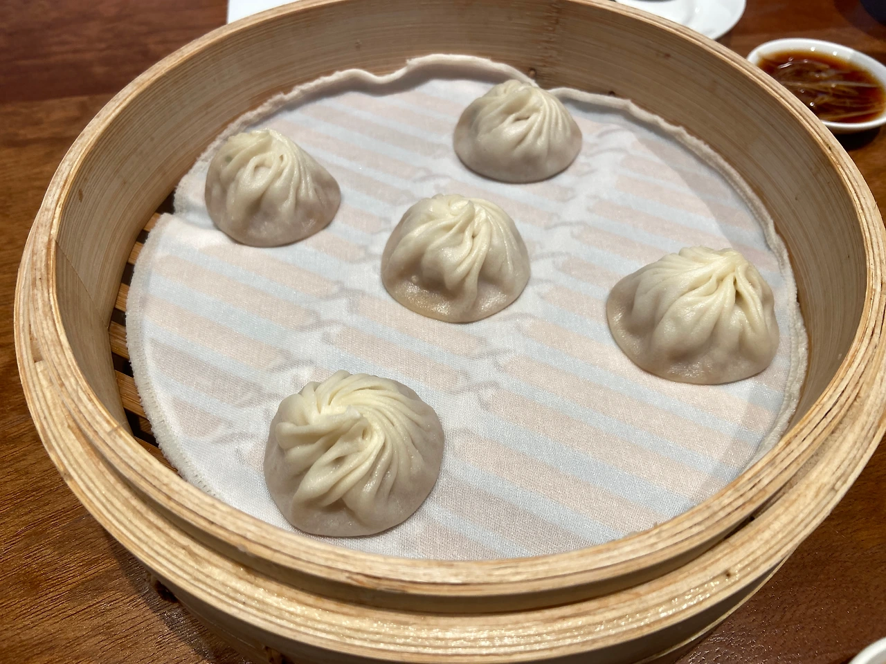 자리에 세팅되어 있는 가지런한 식기 세트. 저 조그만 간장종지만 해도 맛있음을 응축되어 올라가 있는 것 같다. 약간은 단맛이 느껴지는 간장에 식초의 상큼함, 그리고 만두의 육즙의 기름짐을 잡아줄 얇은 생강까지. 완벽한 조합이다. 빨리 샤오롱빠오가 나와 저 간장을 찍어먹고 싶은 마음뿐!