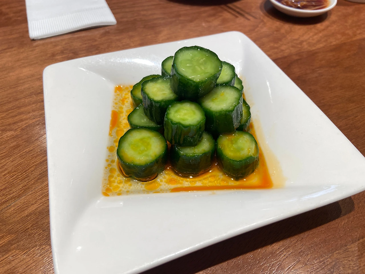 처음으로 나온 메뉴는 인기 메뉴 6위에 달하는 오이 무침(辣味黃瓜)이다. 사실상 대만은 샤오츨(小吃)의 나라. 조그마한 이런 밑반찬들이 사실은 밥상 위의 큰 형님과 같은 맛을 낼 때가 많다. 거기에 한국 사람들의 입맛에도 맞는 상콤하고 매콤한 오이 무침이라니. 조금은 부대낄 수 있는 중식 메뉴에 아주 조화롭게 내 입을 다스려 다음 만두, 다음 메뉴에 다시 기운을 내서 한 젓가락 가져갈 수 있게 도와주는 매우 훌륭한 refreshment. 다른 밑반찬을 도전해 봐도 좋지만 일단 대만에서 오이로 만든 게 있다면 크게 실패 없이 성공할 확률이 높다. 같이 간 일행은 원래 오이를 잘 안 먹는데도 맛있게 잘 먹었을 정도.