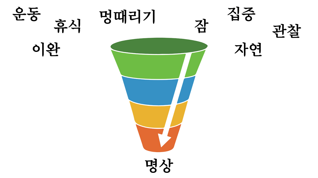 그럼에도 불구하고 인류가 명상을 하나의 방법론으로 정의하고 전수할 수 있는 것은, 마치 깔대기에 떨어진 물이 한 점으로 모이듯 사람마다 천차만별로 다른 경험, 지각으로 명상을 시작하더라도 일정 레벨을 지나면 결국에는 그 경험들이 특정한 방식으로 수렴되기 때문이다.