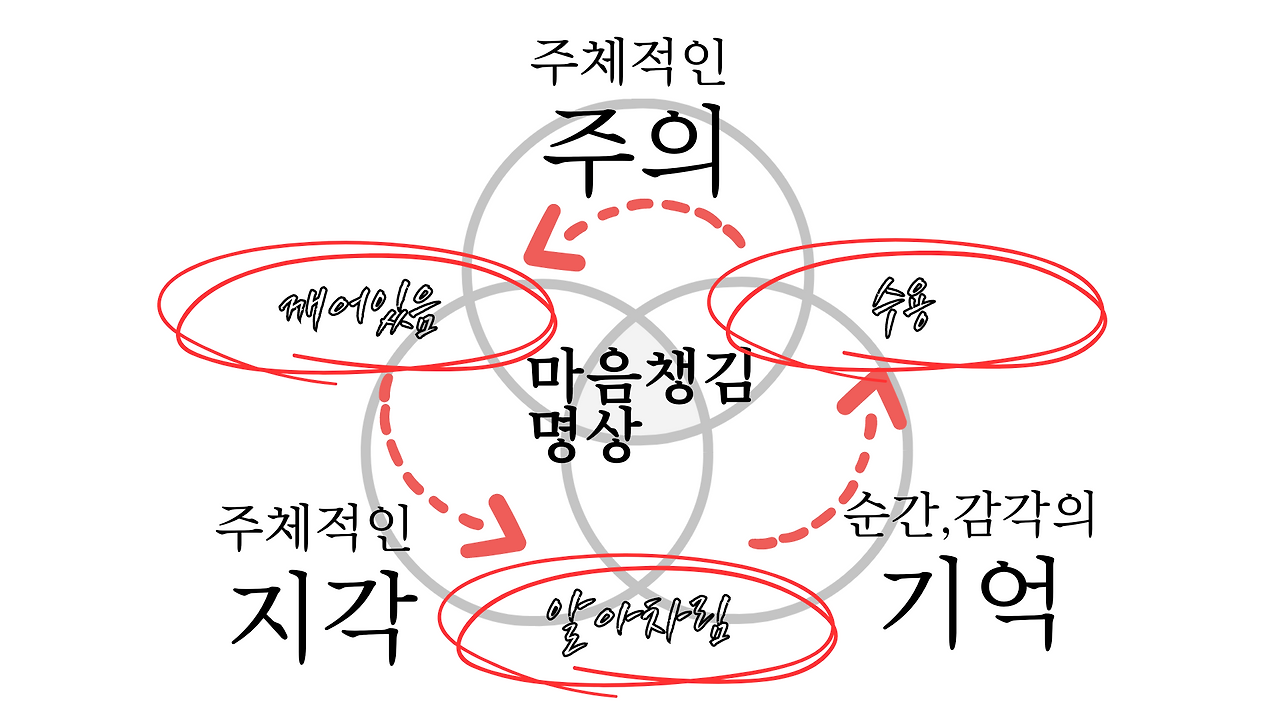 따라서 마음챙김이란 다음의 1-4의 사이클을 일상에서 끊김 없이 계속 돌리는 상태로 이해하는 것이 바람직하다.